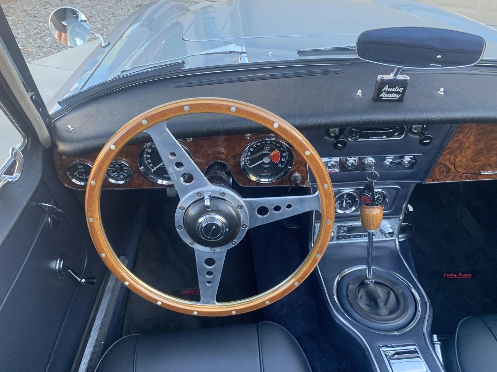 The 2.9-liter inline-six have been rebuilt during the refurbishment and fitted with replacement dual SU carburetors around five years ago. The cylinder head has been modified to accept unleaded fuel, and an alternator has been fitted in place of the factory generator. Additional modifications include Pertronix electronic ignition, a stainless-steel exhaust system, cast-aluminum oil pan and valve cover, an oil cooler, a spin-on oil filter, upgraded radiator core with an electric fan, and a negative ground electric conversion.