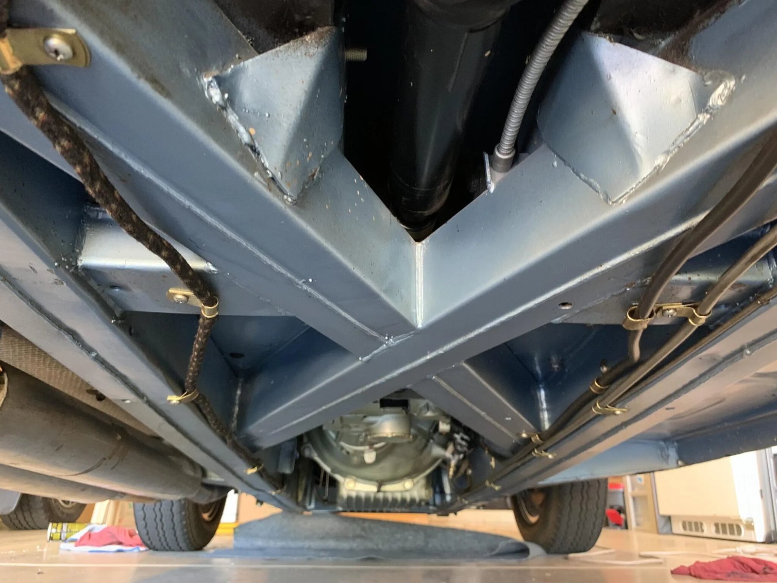 Power is sent to the rear wheels through a four-speed manual transmission with overdrive. The gearbox was rebuilt during the refurbishment in the late 1990s and fitted with a replacement first gear layshaft, bearings, and synchro rings. Additional work at that time have included rust repairs on the chassis, seam-welding the floor pans, replacing the trunk floor and framework around the trunk opening, and installing steel bracing on the firewall around the transmission opening.