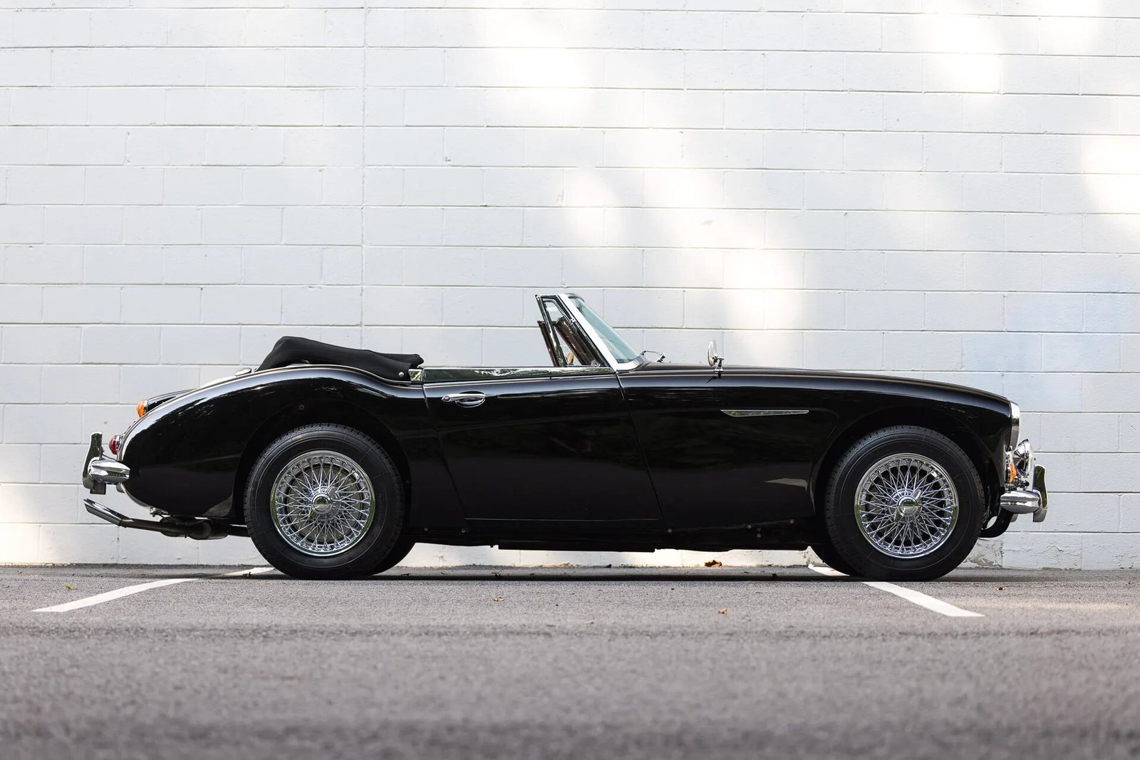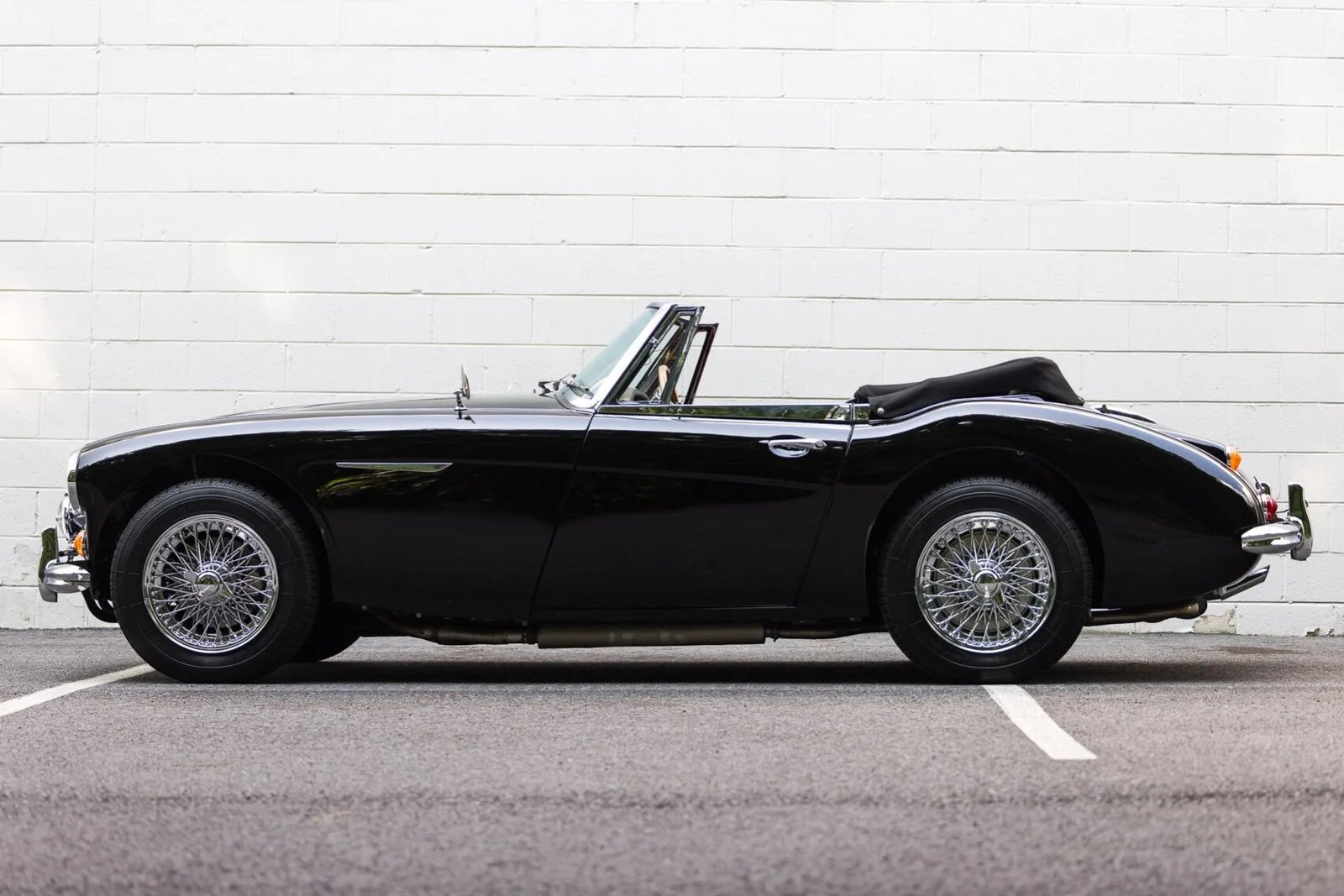 This 1966 Austin-Healey 3000 BJ8 Mk III was refurbished in the early 2000s, and work included repainting the bodywork in black and installing a five-speed Toyota manual transmission. The engine was also overhauled. Equipment includes a black soft top and top boot, 15″ knock-off wire wheels, front disc brakes, dual SU carburetors, driving lights, red leather upholstery, and a LeCarra wood-rimmed steering wheel.