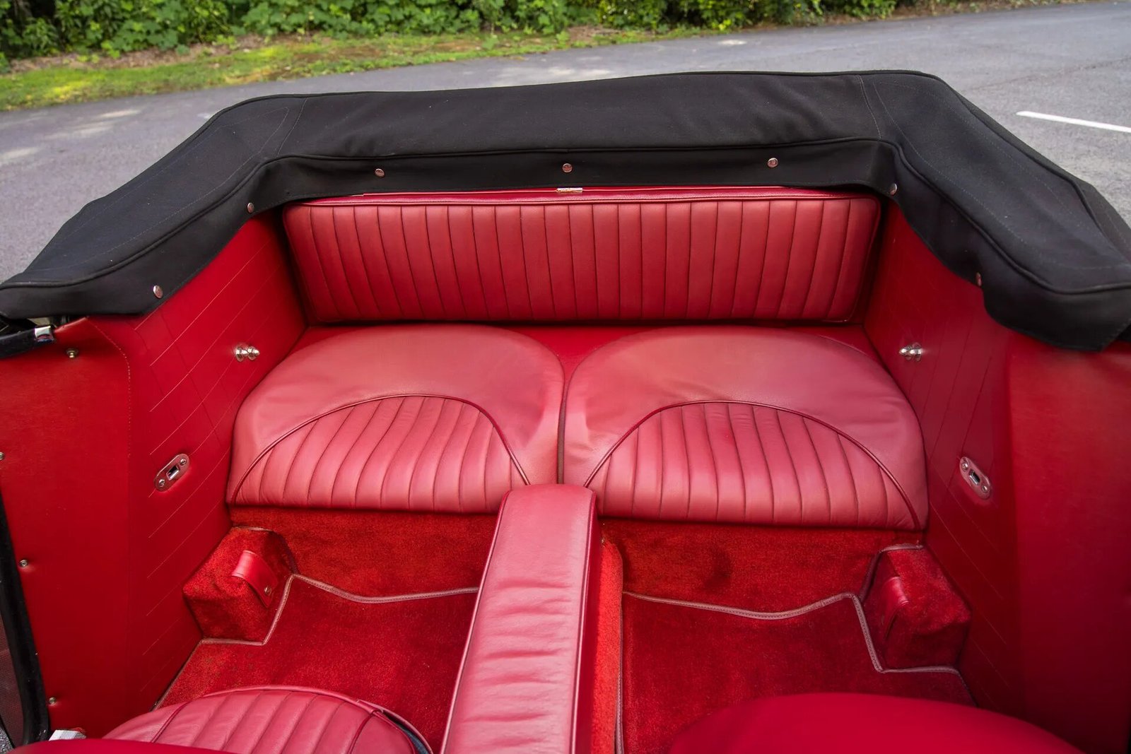 The car left the factory in Ivory White, and a refurbishment in the early 2000s included a bare-metal repaint in black. Exterior details include a black soft top and matching top boot, chrome bumpers with overriders, fender-mounted side mirrors, bright trim, driving lights, and a front badge bar.