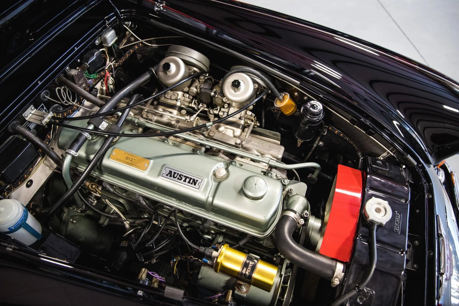 The 2.9-liter inline-six was overhauled during the build and fitted with an aftermarket camshaft and valve springs as well as upgraded SU carburetors. A five-speed manual gearbox was installed using a Smitty conversion kit, a dual exhaust system is installed, and an exhaust hanger fixing point was repaired.