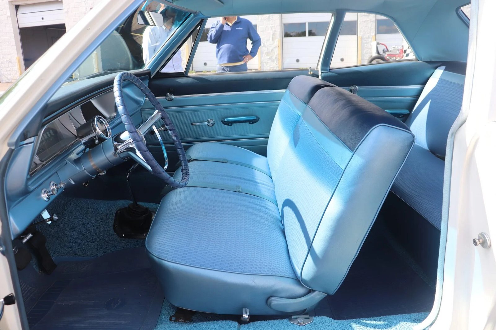 A two-tone blue color scheme is carried throughout the interior, including the dual bench seats seat, carpeting, door panels, and dashboard.