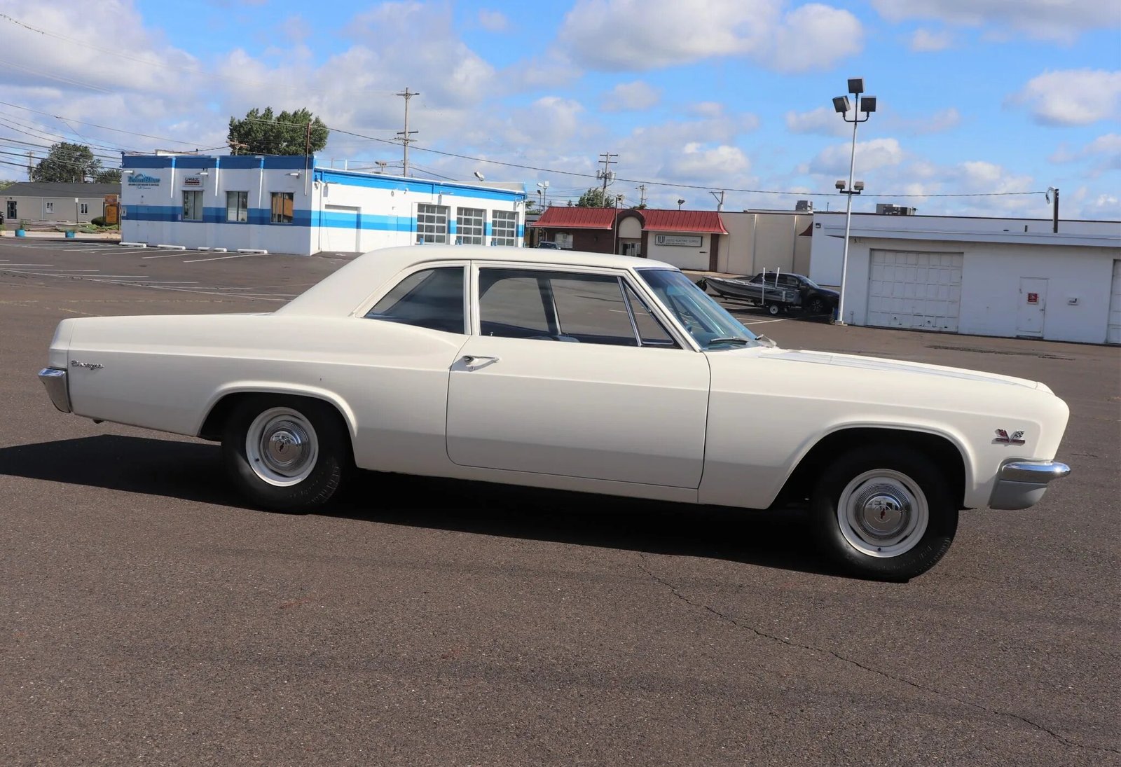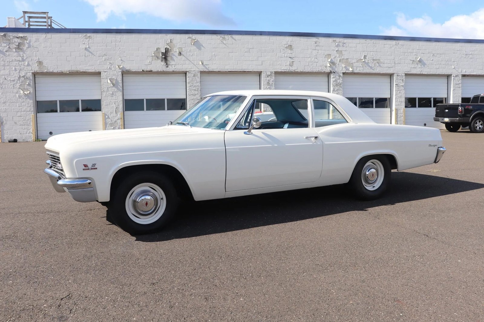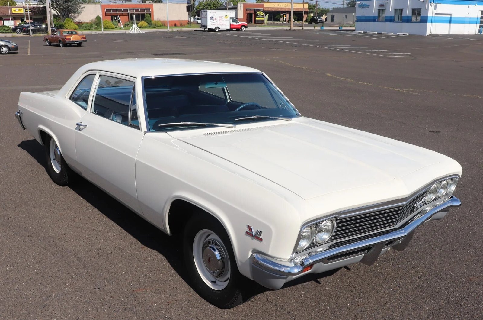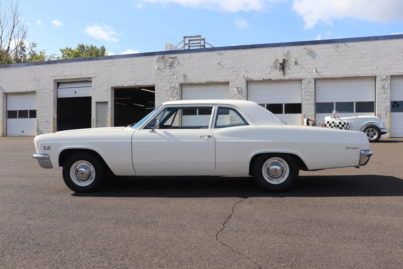 This 1966 Chevrolet Biscayne began life as a six-cylinder two-door sedan. The car was refurbished and modified approximately six years ago, with work included a repaint of the exterior, refinishing the frame, and replacement of the powertrain. Its 468ci V8 is paired with a T-10 four-speed manual transmission, and additional modifications include a limited-slip rear end, a Hurst shifter, and a dual exhaust system with MagnaFlow mufflers and electronically actuated exhaust cutouts.