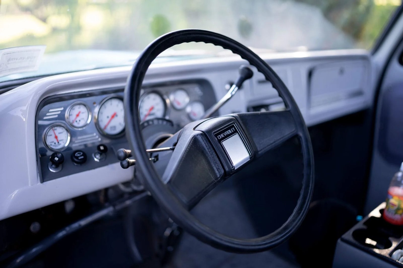 The later-model steering wheel is mounted to a tilt-adjustable steering column and fronts aftermarket instrumentation consisting of a 160-mph speedometer, an 8k-rpm tachometer, and gauges for coolant temperature, battery voltage, oil pressure, and fuel level, housed in a polished panel.