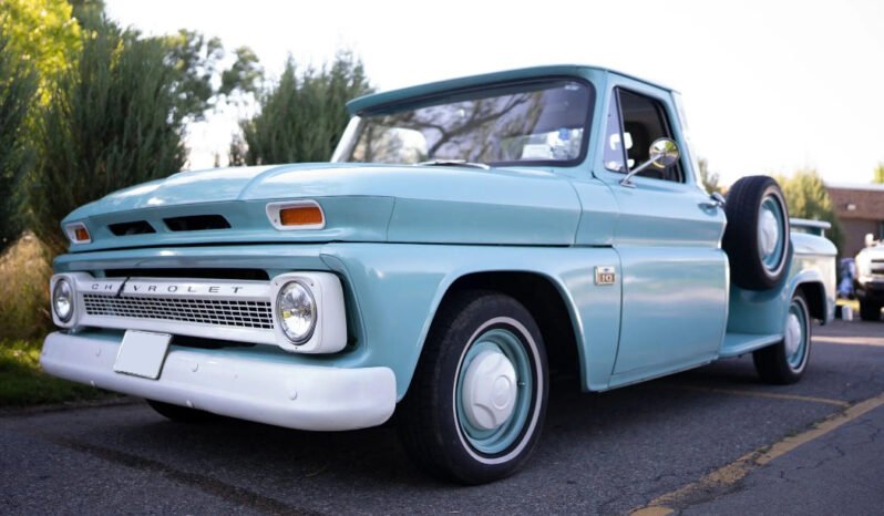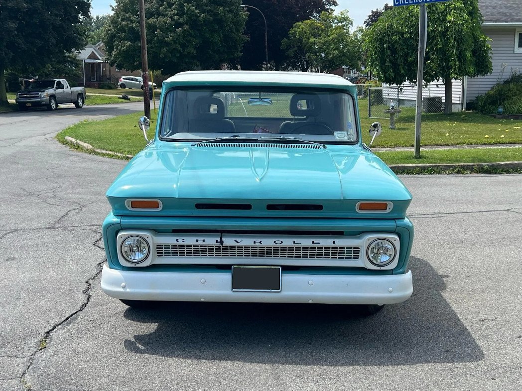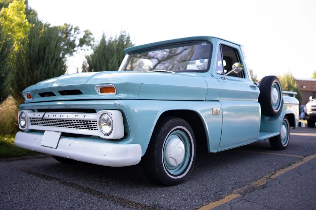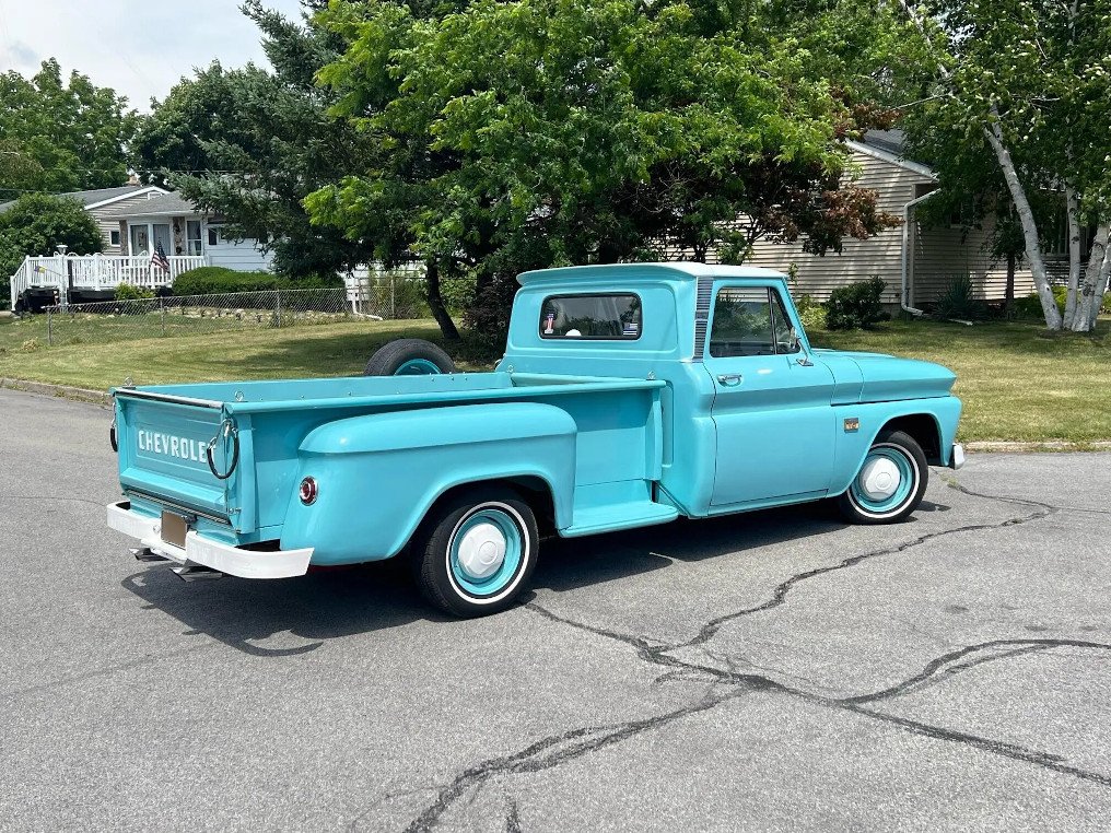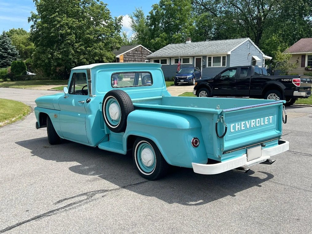 The truck was repainted in turquoise and is accented by a white-painted roof, grille, bumpers, and Chevrolet lettering on the tailgate.