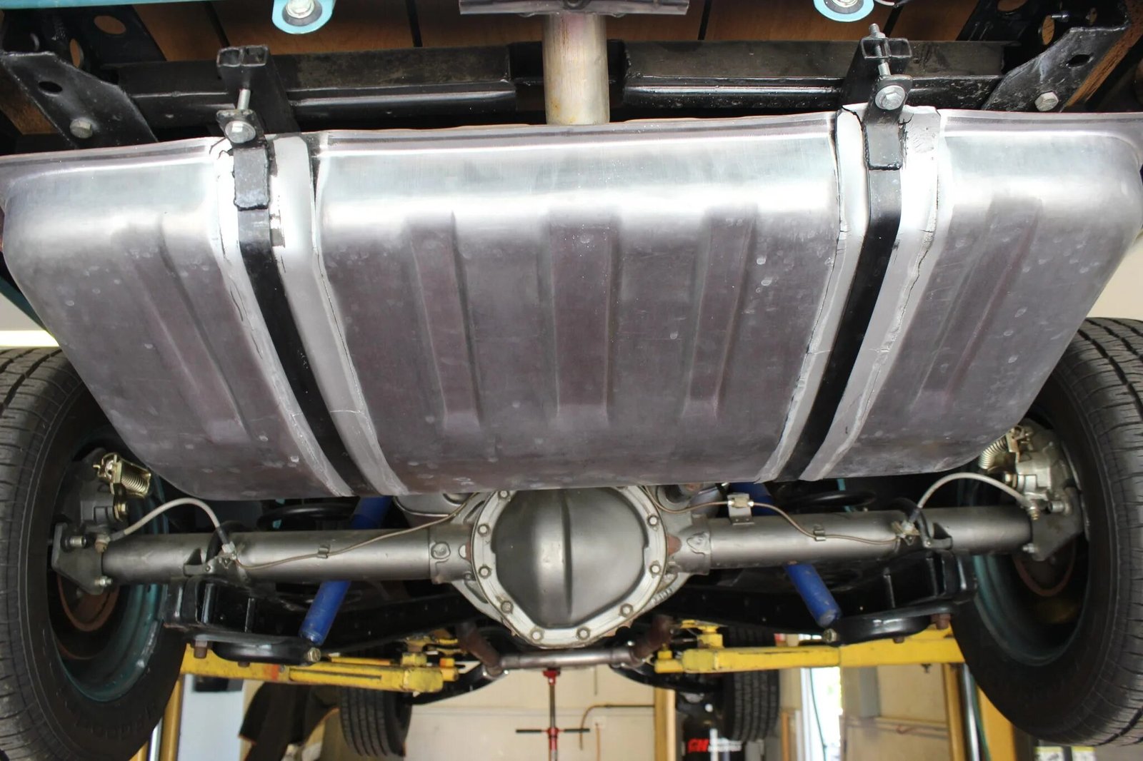 A GM 350ci V8 crate engine was installed and features an Edelbrock intake manifold, carburetor, and air cleaner, along with MSD ignition, an aluminum radiator with an electric fan, billet pulleys, and a chrome-finished alternator body. The fuel tank has been repositioned behind the rear axle. An oil change was performed in preparation for the sale.