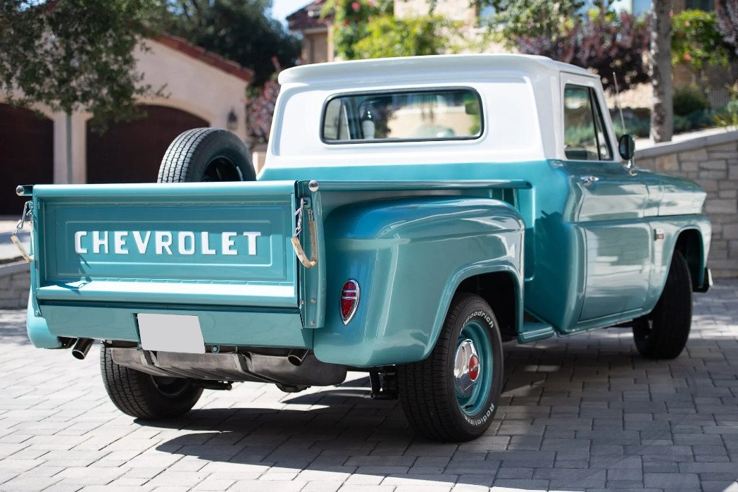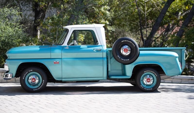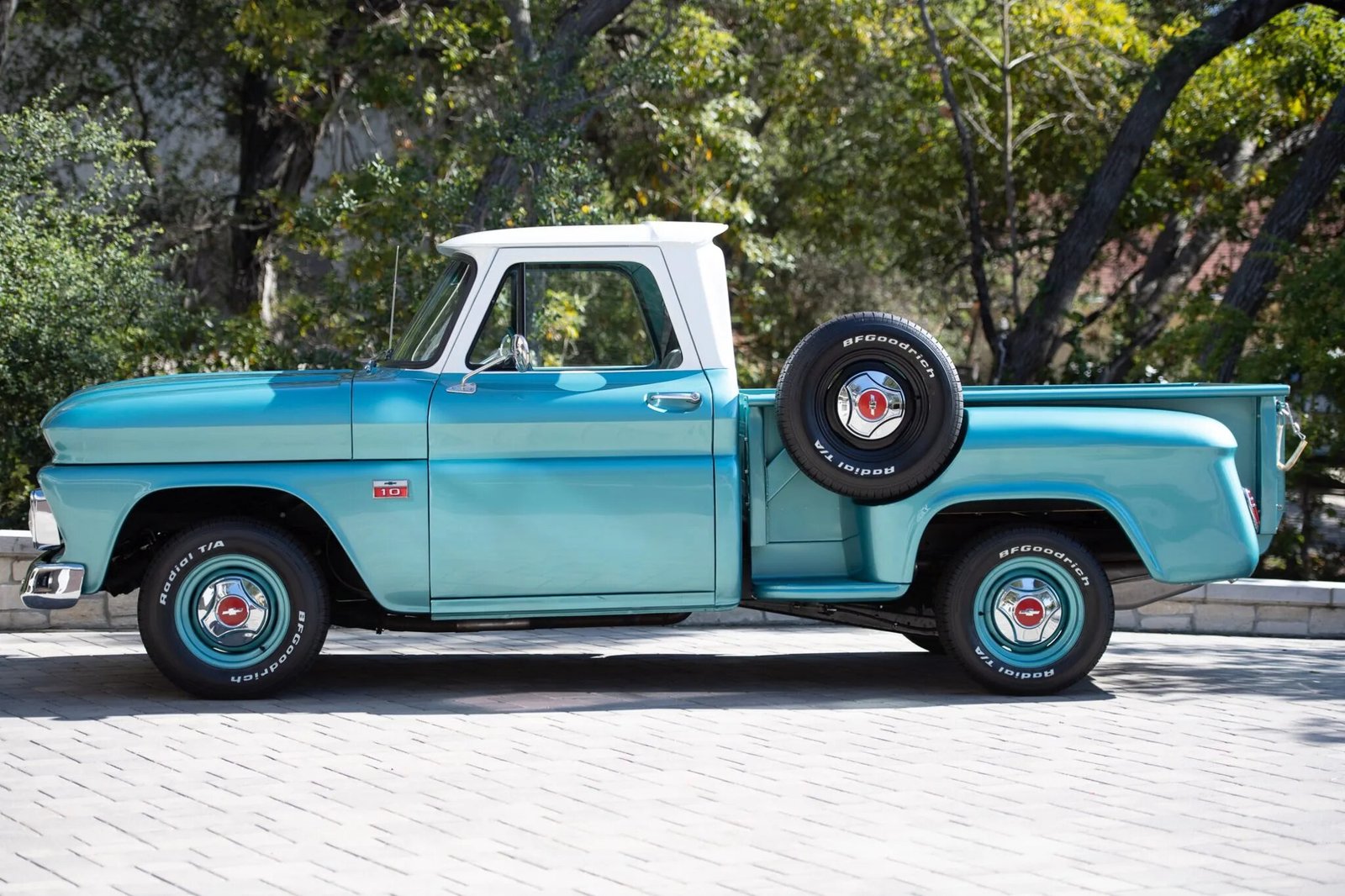 This 1966 Chevrolet C10 is a Stepside pickup that is powered by a 350ci V8 paired with a four-speed 700R4 automatic transmission. A refurbishment have been completed in 2015. It is finished in teal with a white roof over white and gray upholstery. Equipment includes an Edelbrock intake manifold, carburetor, and air cleaner, along with an MSD ignition system, tubular headers, dual exhaust, four wheel disc brakes, a wood-slat bed floor, air conditioning, a Kenwood CD stereo, and a floor-mounted shifter.