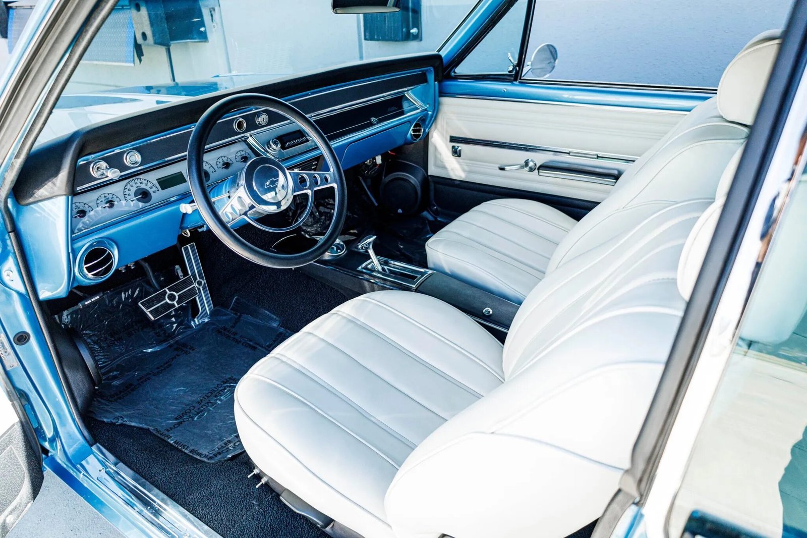 The cabin features front bucket seats and a rear bench upholstered in white vinyl joined by color-coordinated door panels.