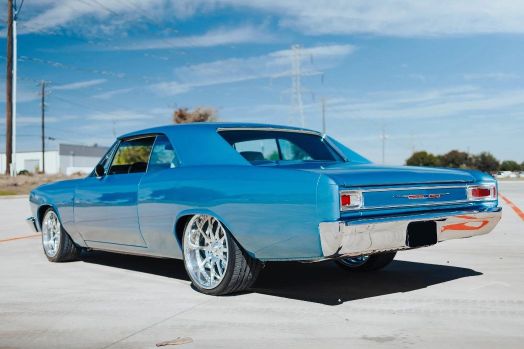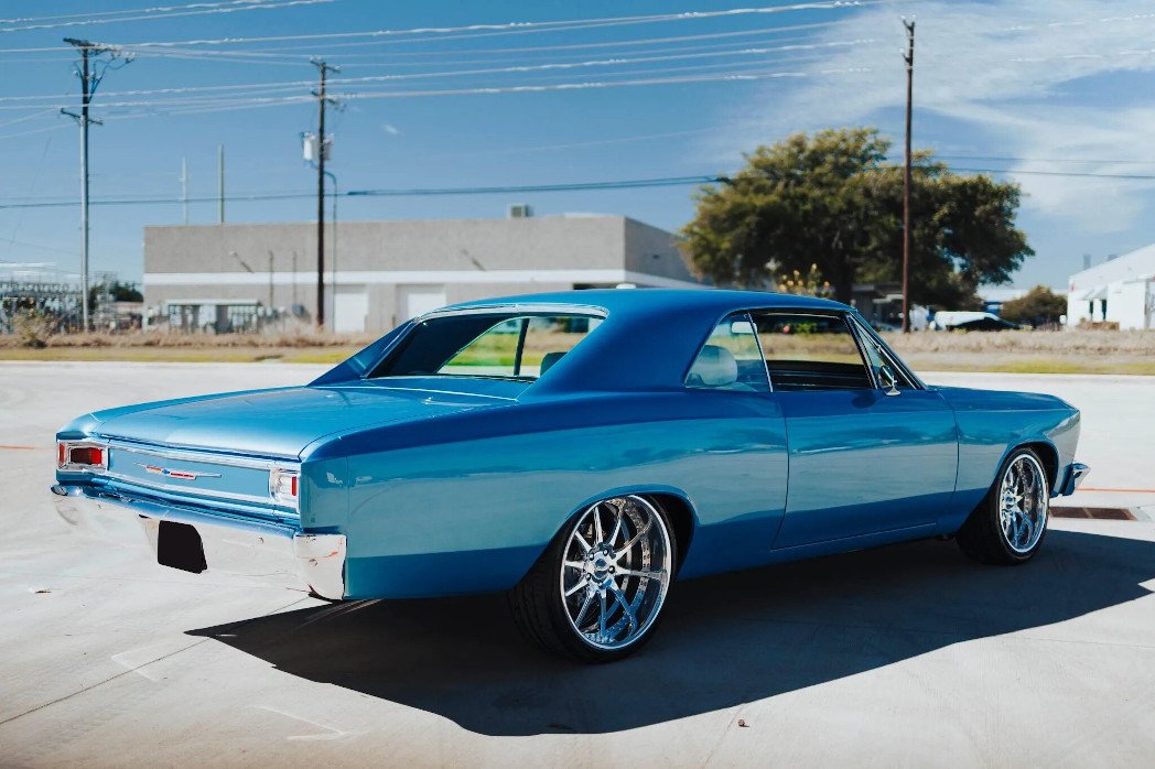 This 1966 Chevrolet Chevelle Malibu sport coupe is powered by a replacement 350ci V8 mated to a TH350 three-speed automatic transmission and is finished in blue over white upholstery. Features include Vintage Air climate control, power steering, power-assisted disc brakes, Ridetech suspension, adjustable coilovers, 18 and 20″ OE Customs wheels, an Edelbrock intake manifold, a Demon four-barrel carburetor, a C1 chrome serpentine drive, MSD HEI distributor, remote keyless entry, power windows, a custom audio system, and Dakota Digital instrumentation.