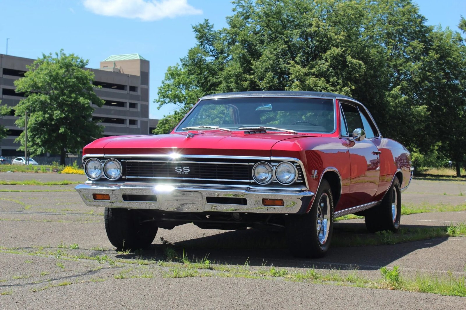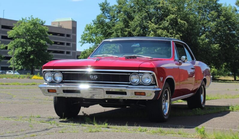 This 1966 Chevrolet Chevelle SS396 is finished in red over black and powered by a 396ci V8 paired with a Muncie four-speed manual transmission. Features include a black vinyl roof, polished rocker trim, 15″ Rally wheels, power brakes, front bucket seats, an electric clock, chrome bumpers, a black tail panel and grille, a tachometer, a retro-style digital stereo, and a dual exhaust system with Flowmaster mufflers.