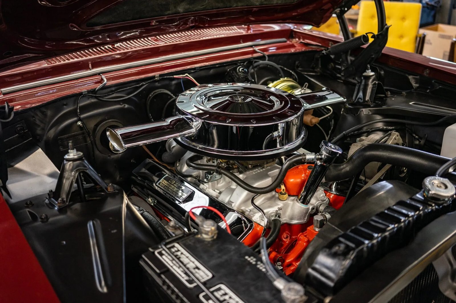 A mechanical refresh on the 327ci L79 V8 was carried out, equipment includes a dual-snorkel chrome air cleaner assembly and an aftermarket dual exhaust system.