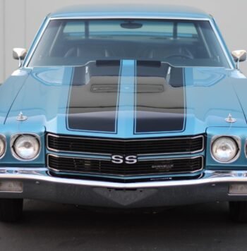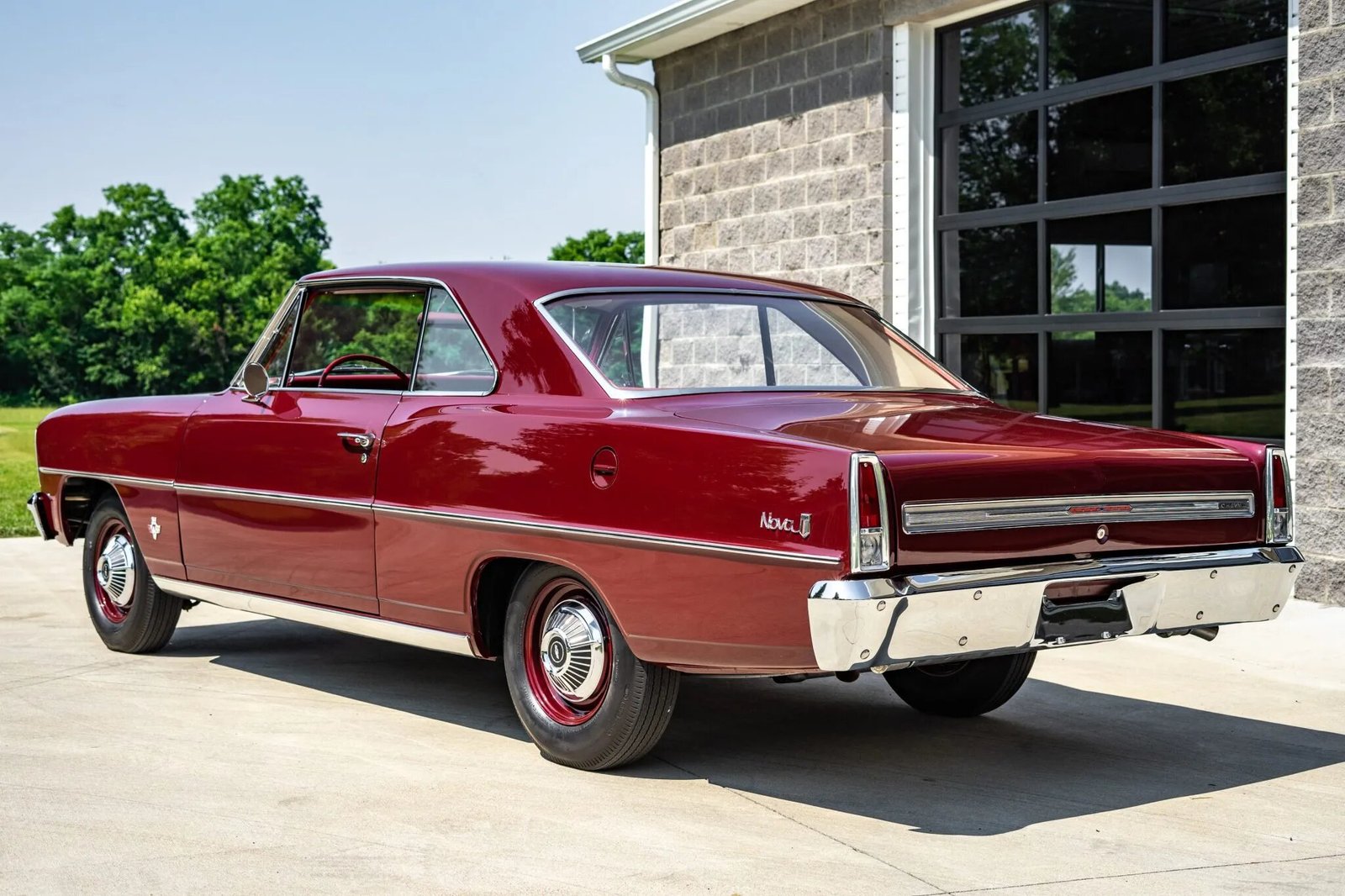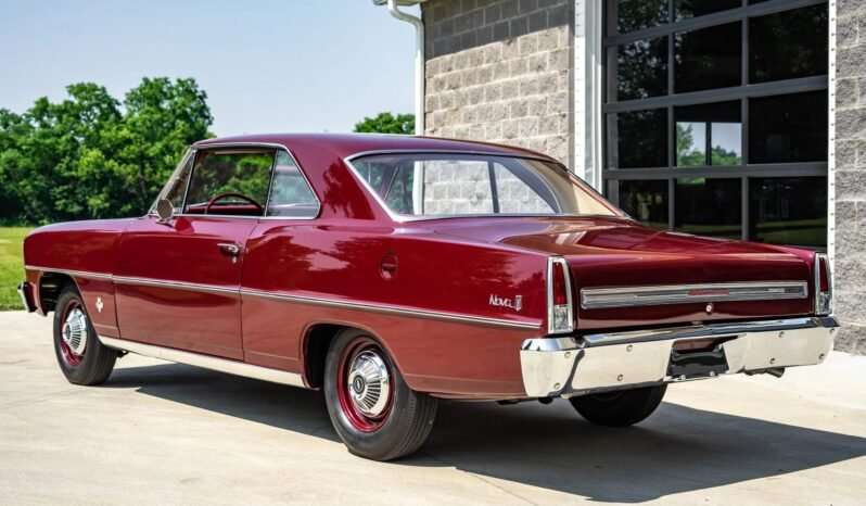 This 1966 Chevrolet Chevy II Nova is powered by a 327ci L79 V8 mated to a four-speed manual transmission and a 12-bolt rear axle and is finished in maroon over red upholstery. Equipment includes 14″ steel wheels, a dual exhaust system, drum brakes, chrome bumpers, a heater and defroster, and a Delco push-button AM radio.