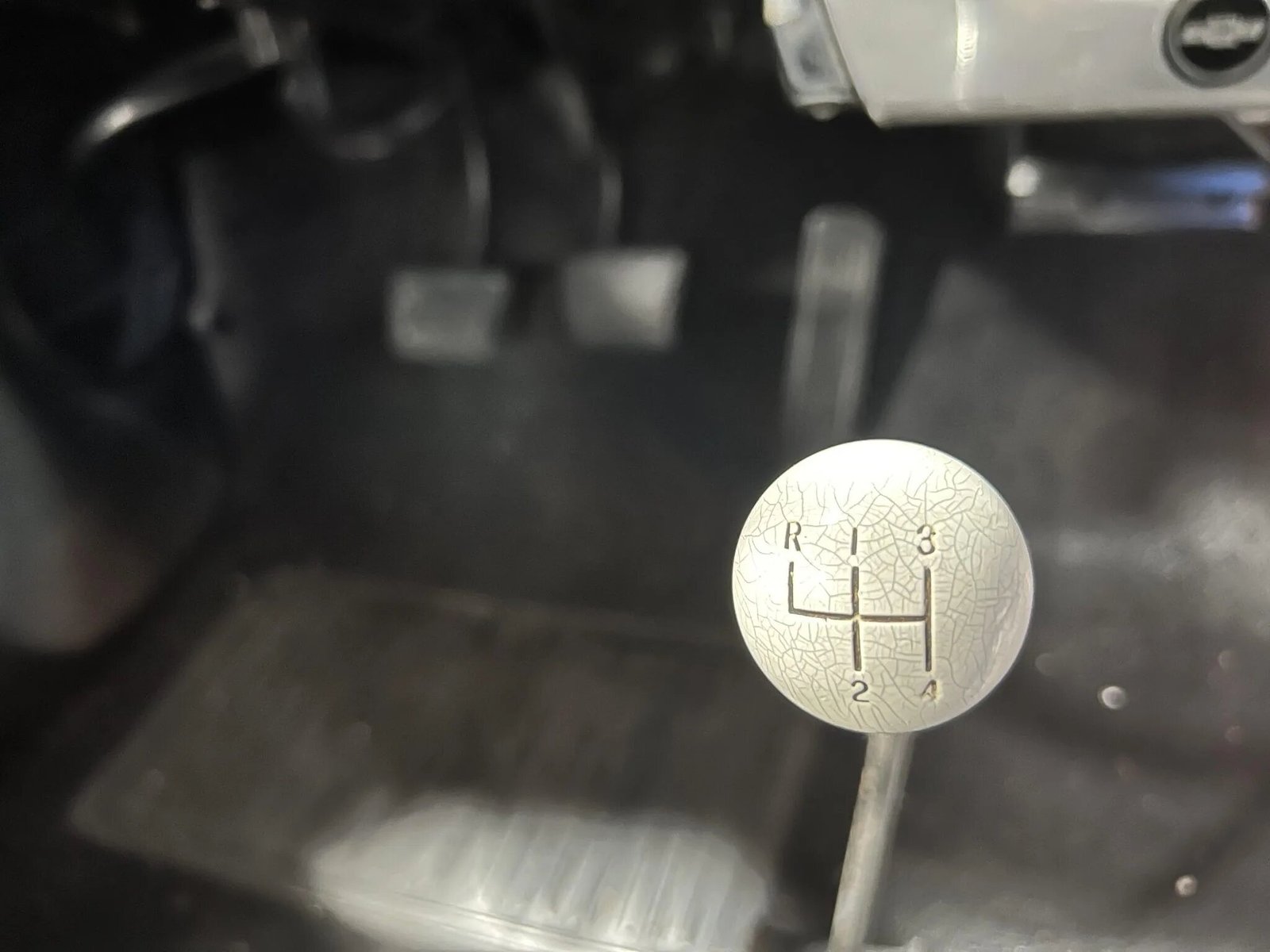 Features includes a floor-mounted shifter with a cue-ball shift knob, a Delco push-button AM radio, and front bucket seats equipped with headrests.
