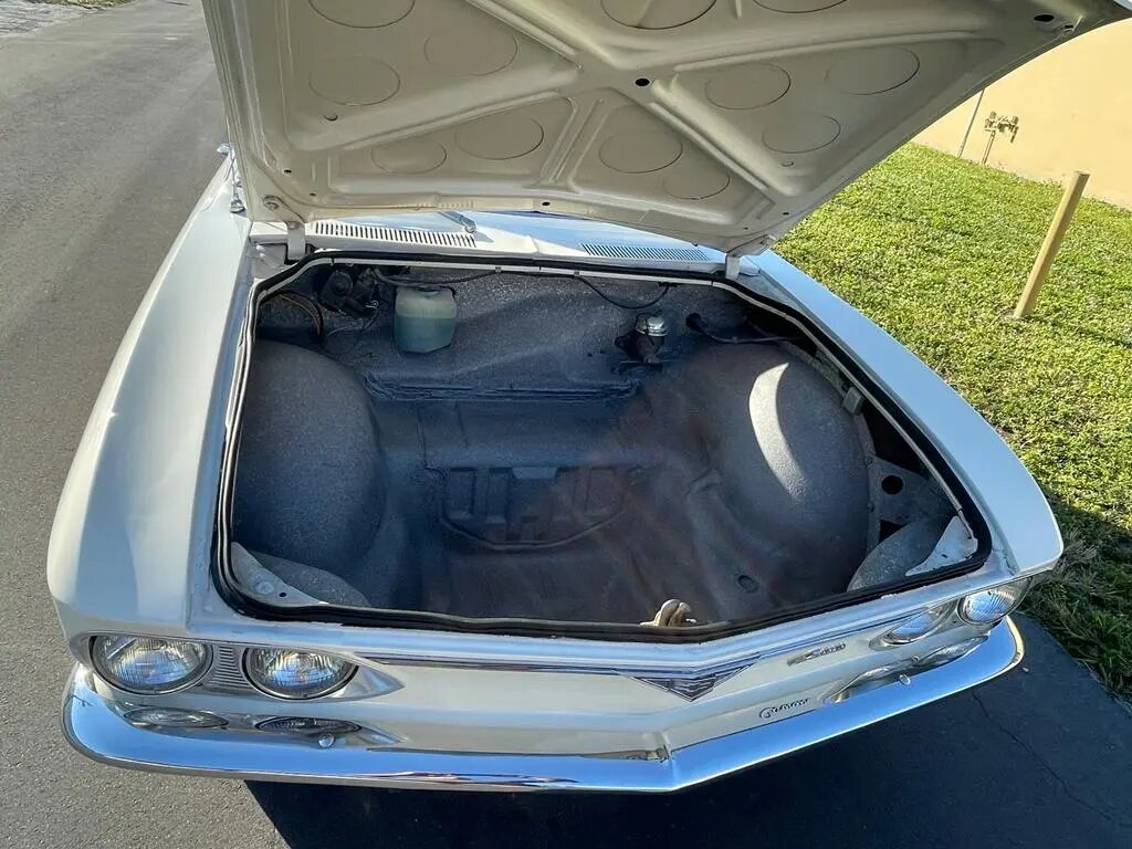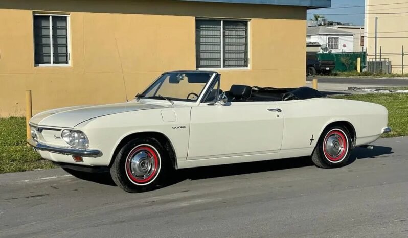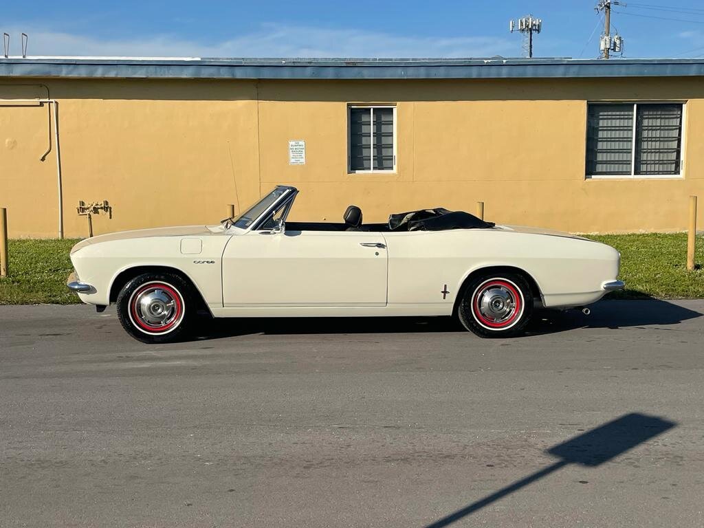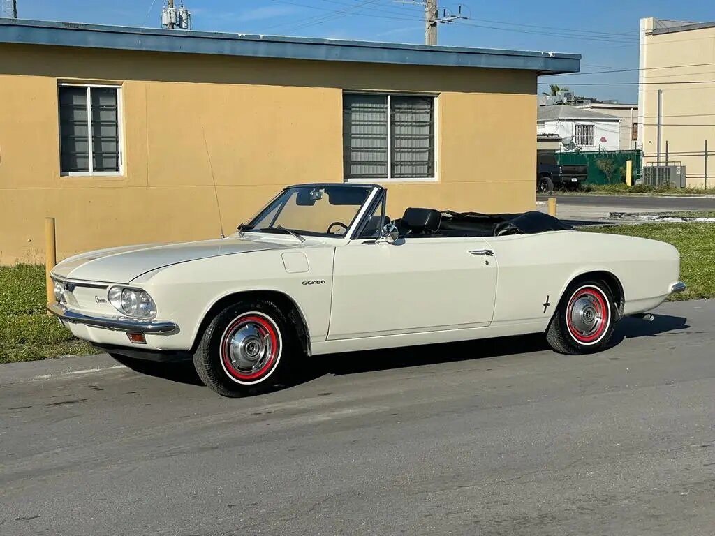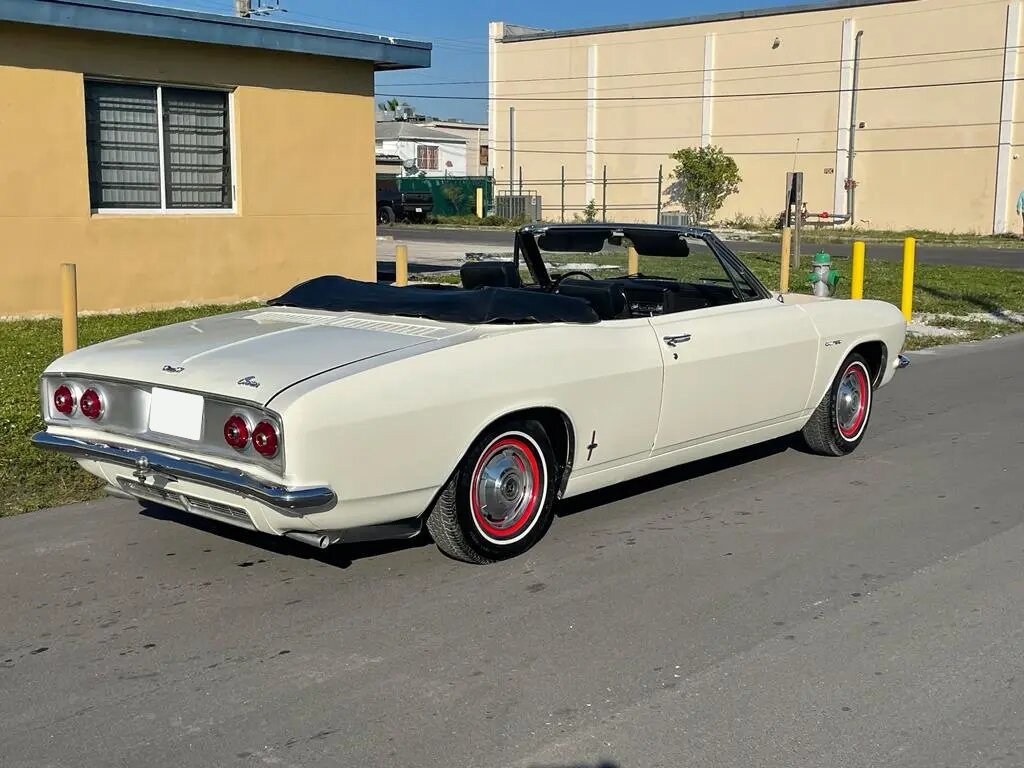 This 1966 Chevrolet Corvair Corsa convertible is finished in white over black upholstery and is powered by a 164ci flat-six equipped with four carburetors and mated to a four-speed manual transaxle.