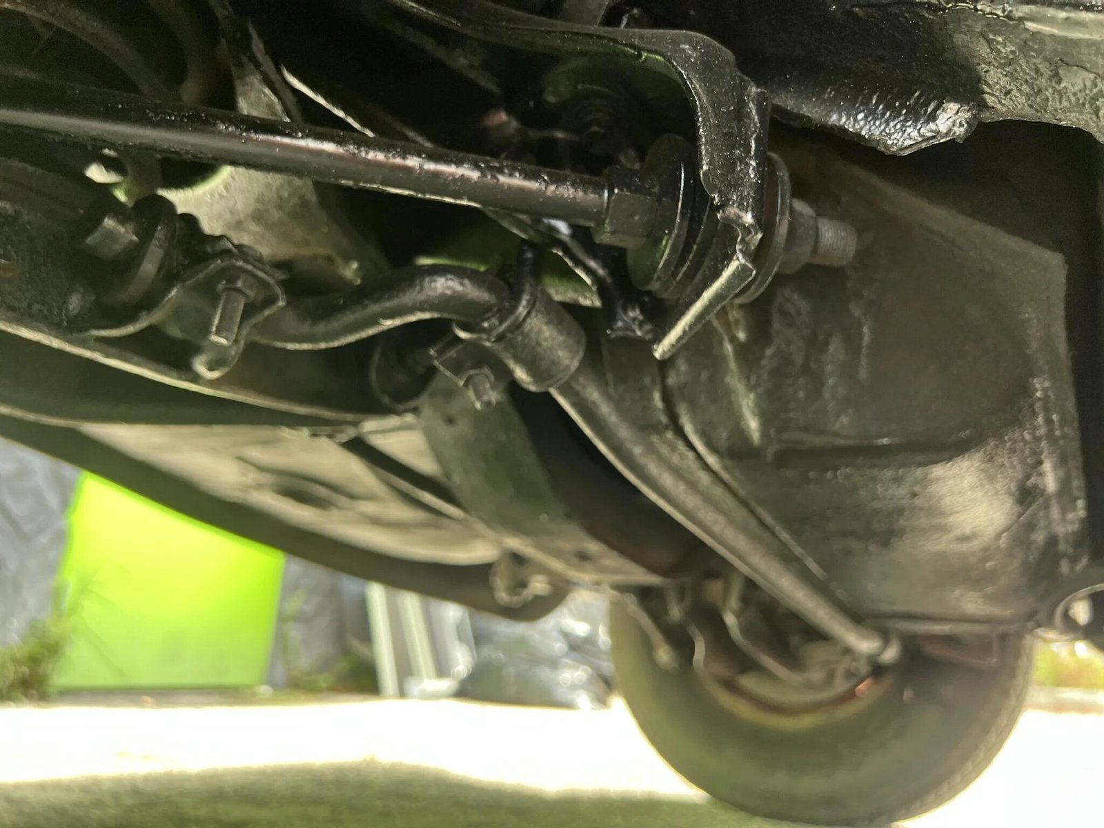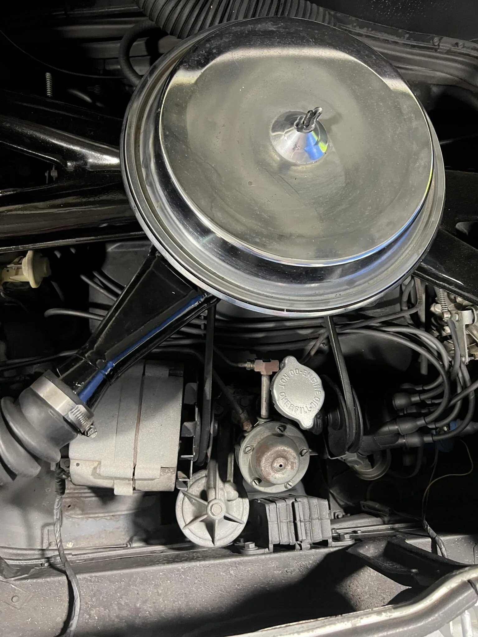 Red-painted 13″ steel wheels feature Corvair-branded covers and are fitted with 185/80 Goodyear thin-whitewall tires.