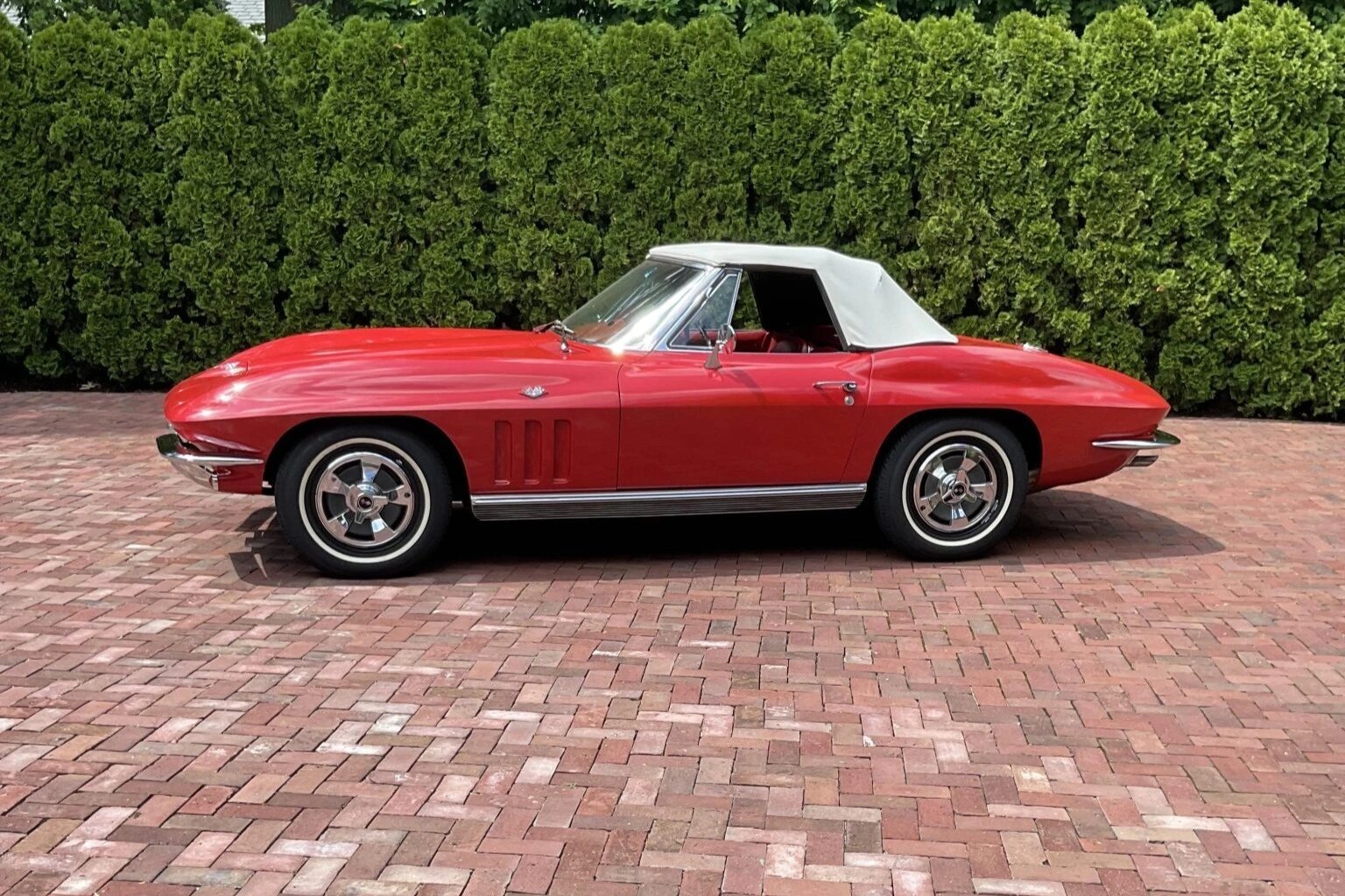 The car was originally delivered in Rally Red and is equipped with a white soft top, pop-up headlights, a left-side mirror, and dual exhaust tips that exit through the rear valance.