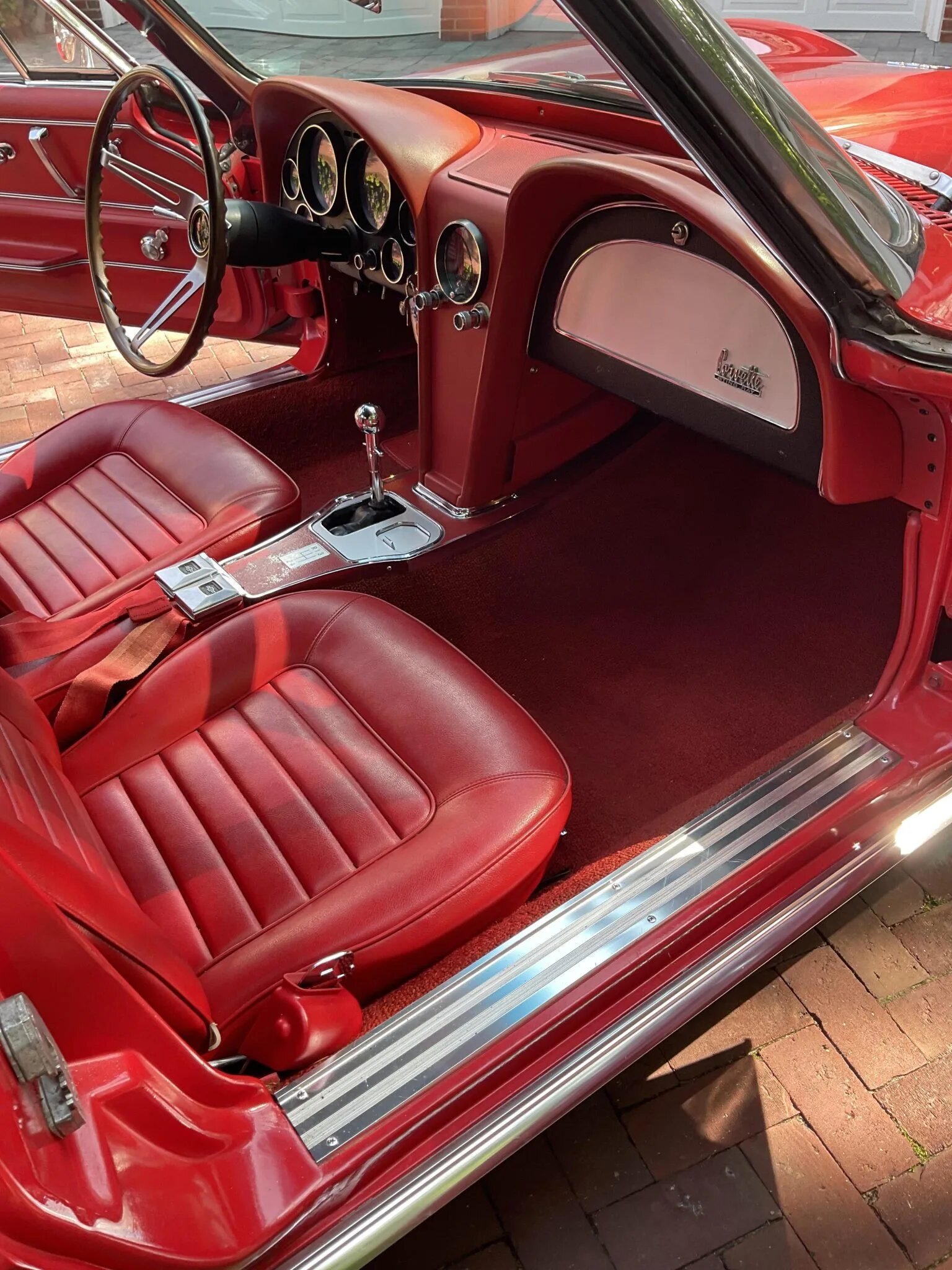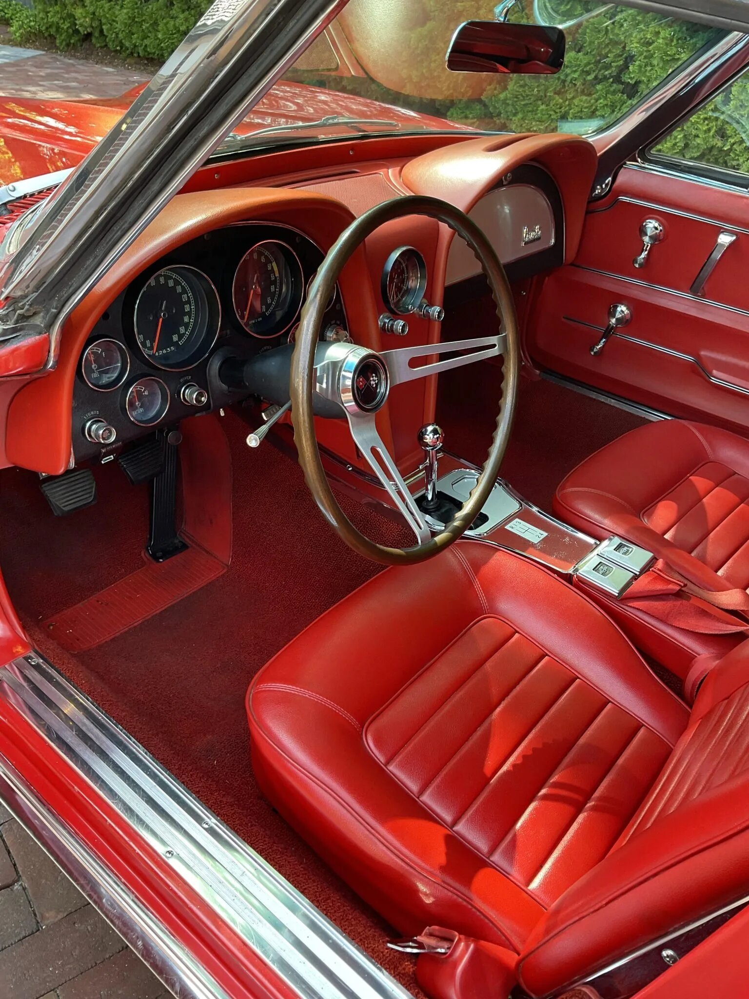 The cabin features seats trimmed in red upholstery along with color-coordinated door panels and carpets.