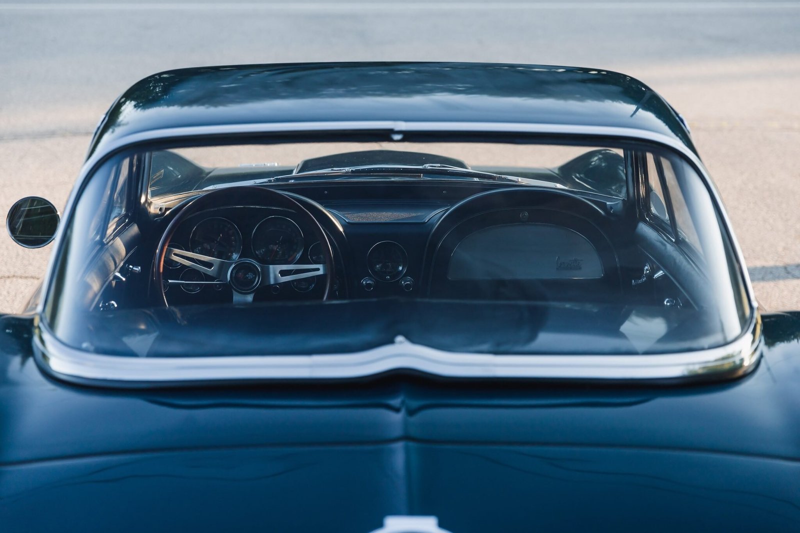 The 15″ turbine wheels are fitted with three-ear knock-off hubs and are mounted with reproduction gold-stripe Goodyear tires.