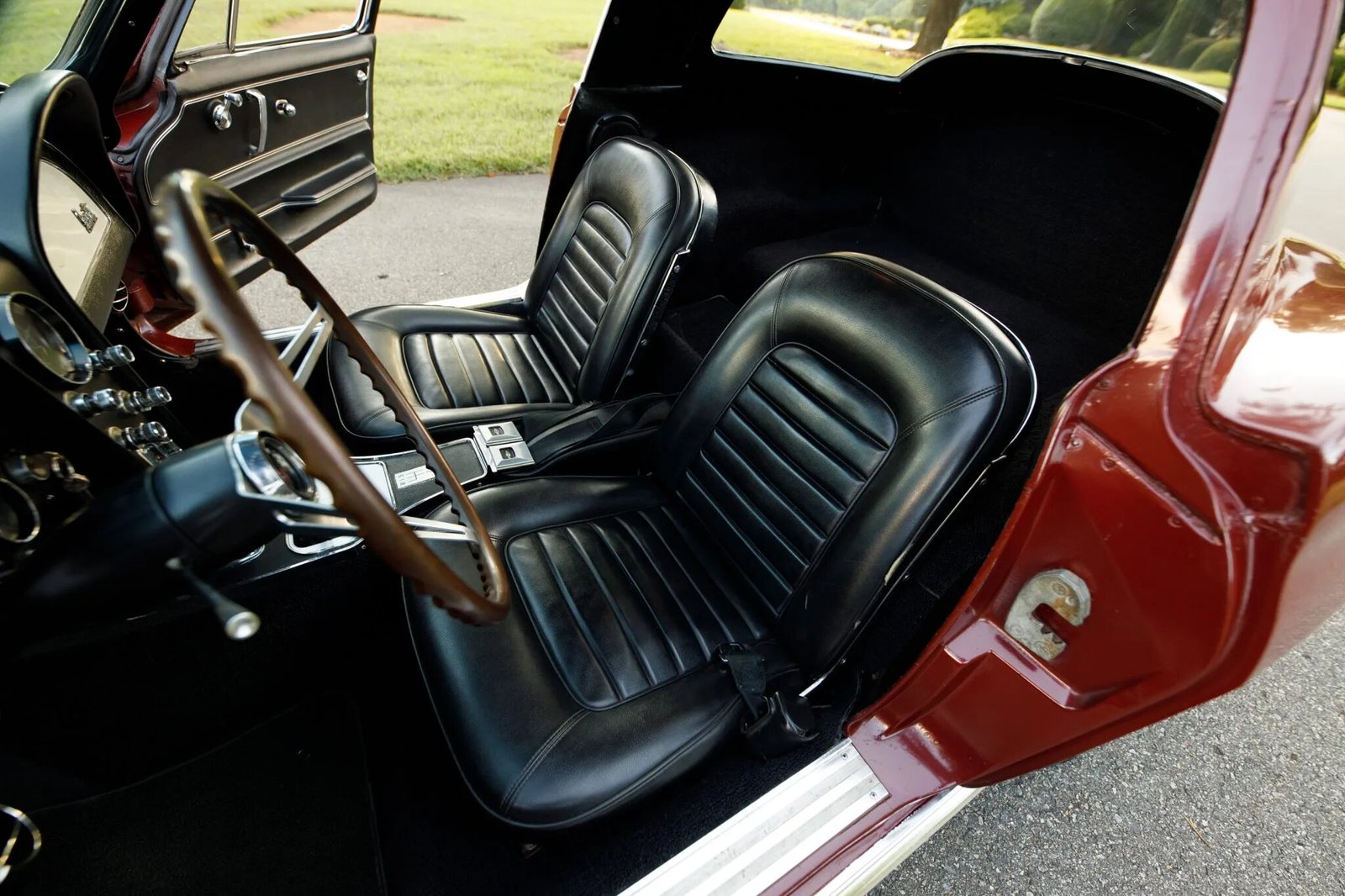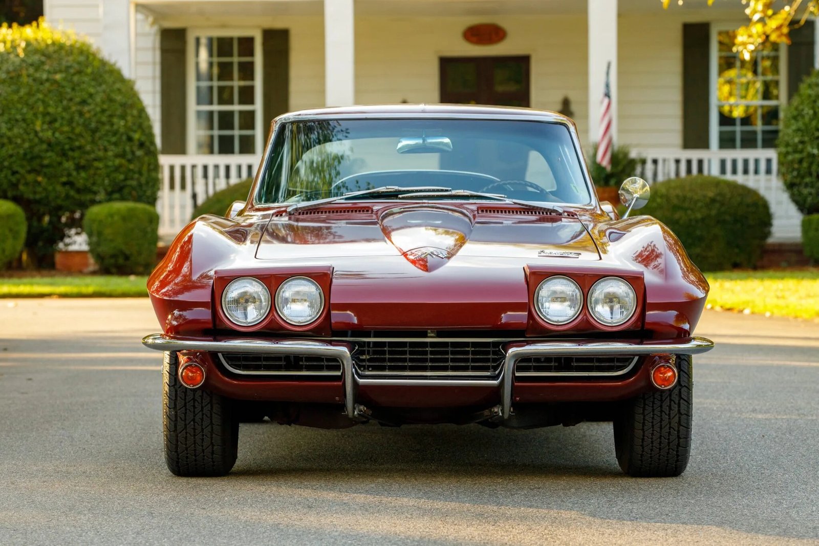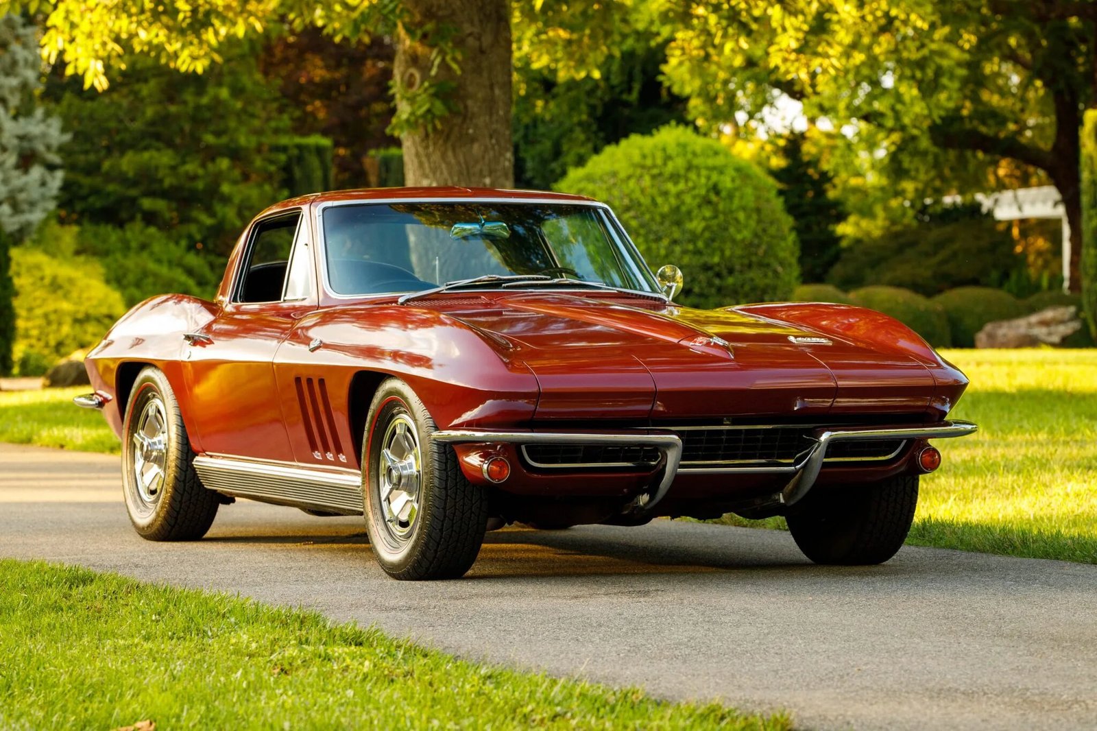 The body was refinished in its factory color of Milano Maroon (988AA) in the 1980s, details include split bumpers, hidden headlights, fender vents, rocker-panel accents, and dual exhaust outlets.