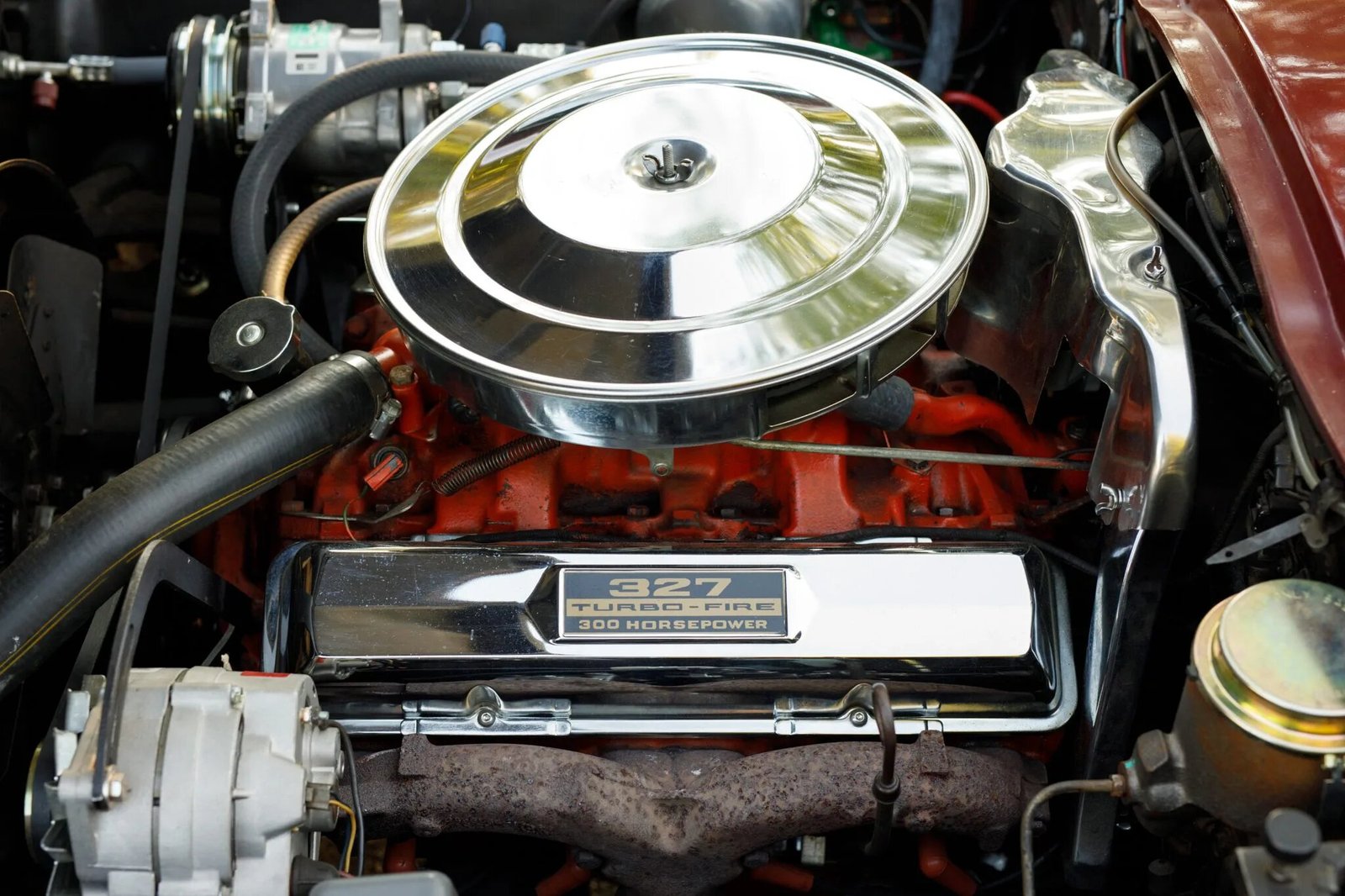 The 327ci V8 was factory rated at 300 horsepower, which is sent to the rear wheels through a four-speed manual transmission and a 3.08:1 Positraction rear end.
