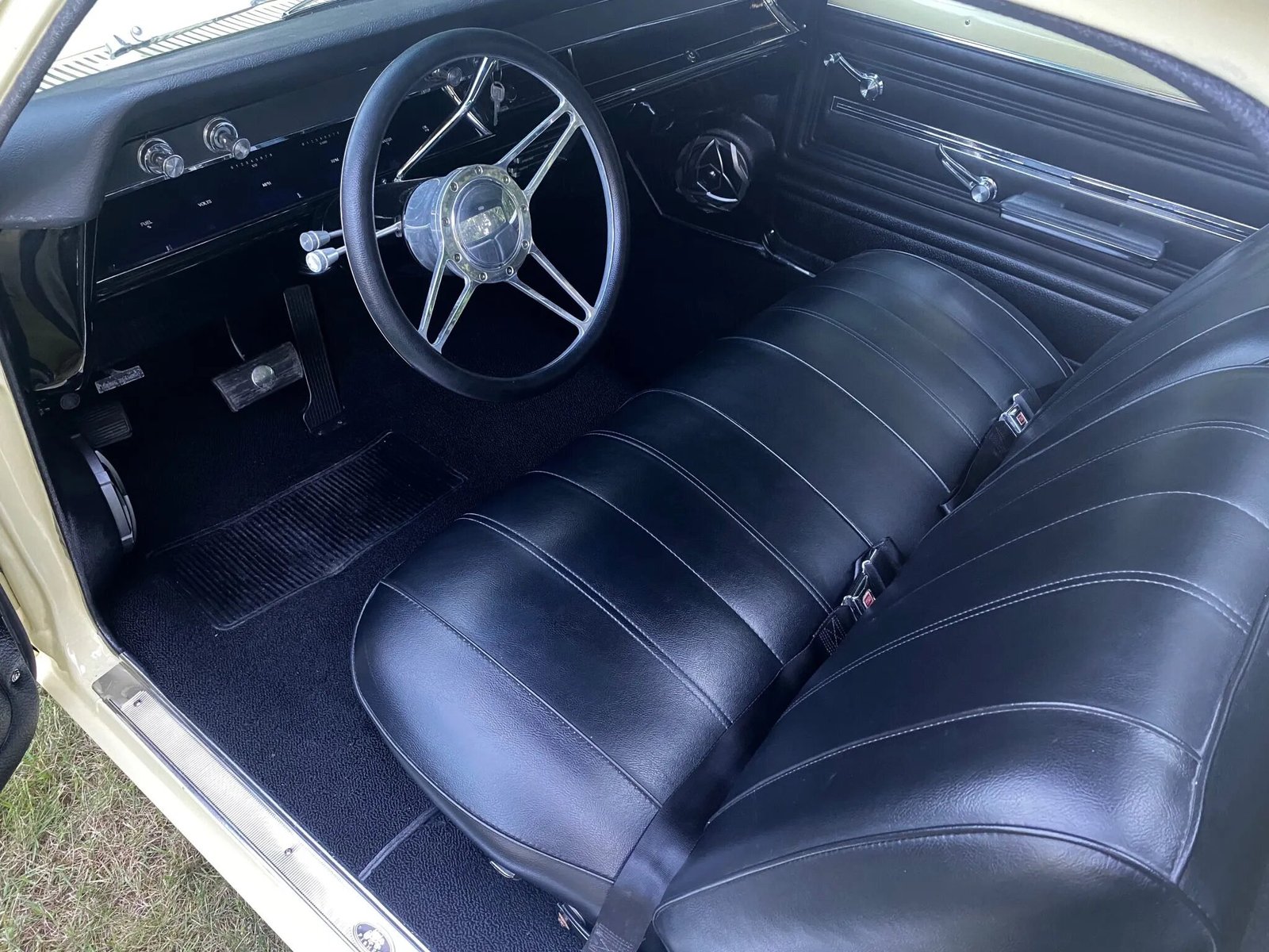 The cabin features a bench seat reupholstered in black vinyl joined by a color-coordinated headliner, dashboard, carpeting, and door panels.