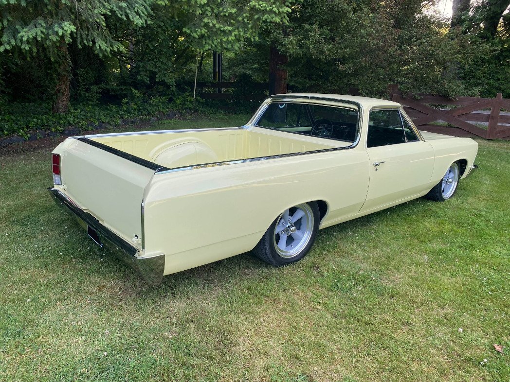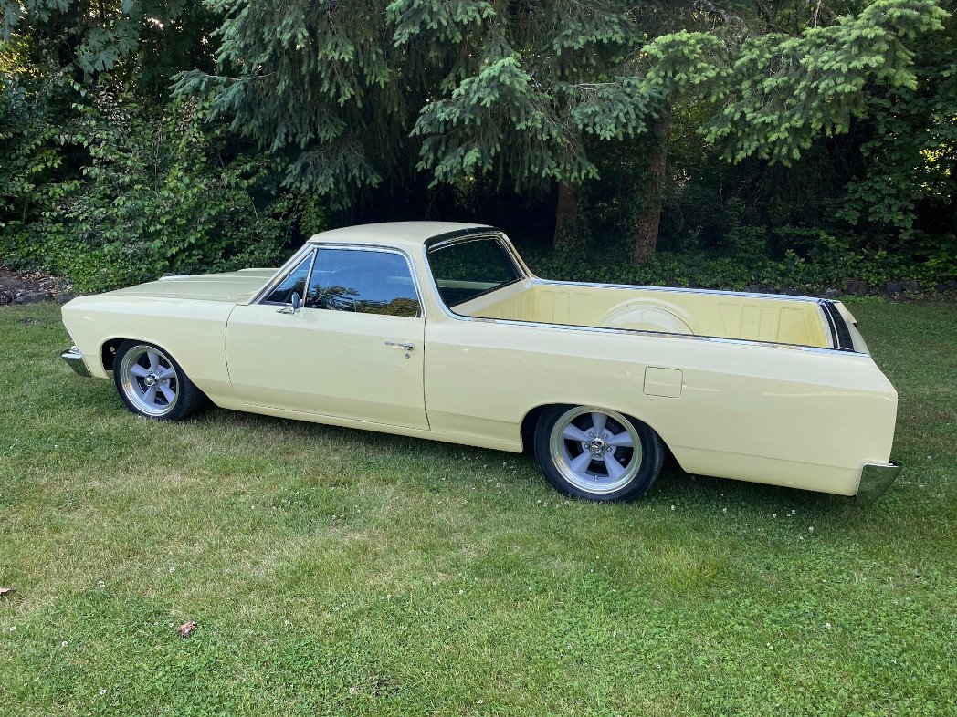 This 1966 Chevrolet El Camino is finished in yellow over black upholstery and powered by a replacement 350ci GM Performance Parts V8 mated to a TCI Street Fighter three-speed automatic transmission. Equipment includes power steering, power-assisted front disc brakes, 17″ American Racing wheels, an Edelbrock four-barrel carburetor, and Hedman Hedders tubular exhaust headers in addition to air conditioning, an Ididit tilting steering column, Dakota Digital instrumentation, Kicker subwoofers, and a Pioneer CD stereo.