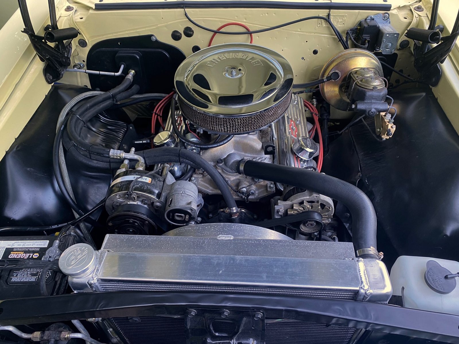 The 350ci V8 GM Performance Parts crate engine was installed and features a serpentine accessory drive system, an aluminum intake manifold, an Edelbrock four-barrel carburetor, an HEI-style distributor, Hedman Hedders tubular exhaust headers, and a chrome air cleaner assembly and valve covers.
