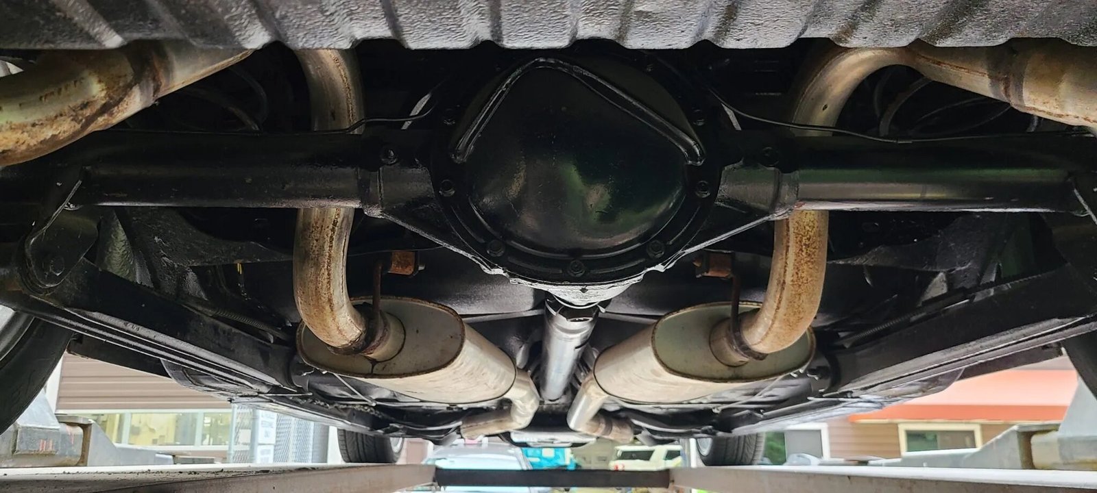An aftermarket dual exhaust system has been installed.