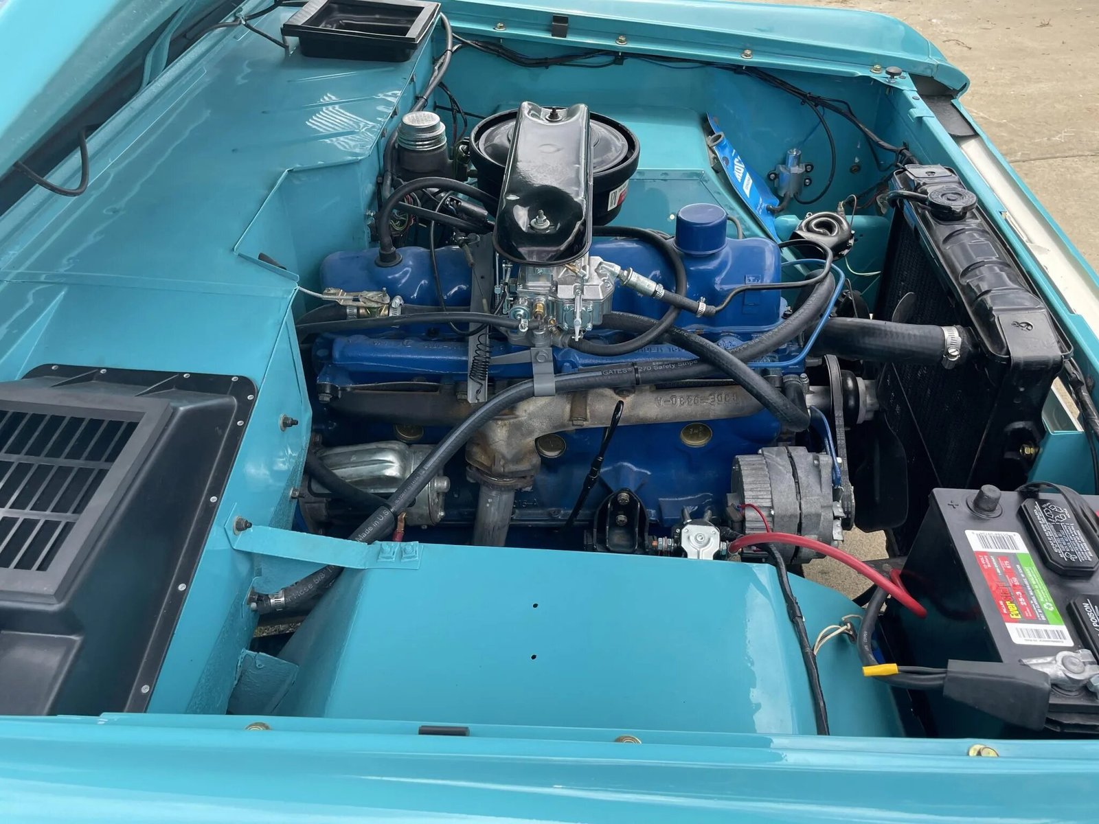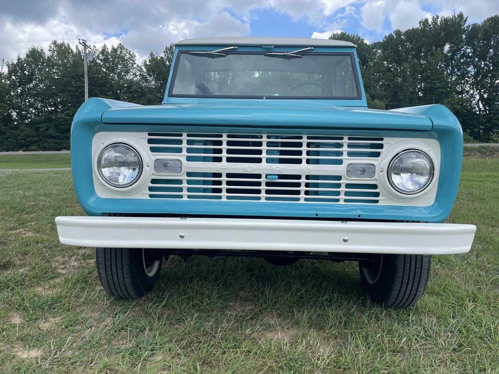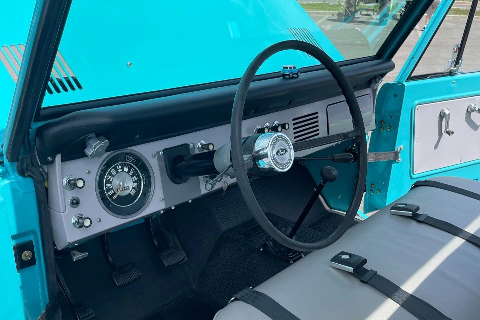 This 1966 Ford Bronco is a half-cab pickup that comes from the first year of production and underwent a body-off refurbishment. The truck is finished in light blue with a white roof over gray vinyl upholstery and is powered by a 170ci inline-six mated with a column-shifted three-speed manual transmission and dual-range transfer case. Features include a white-painted grille and bumpers, drum brakes, 15” steel wheels with chrome covers, and a bed-mounted spare.