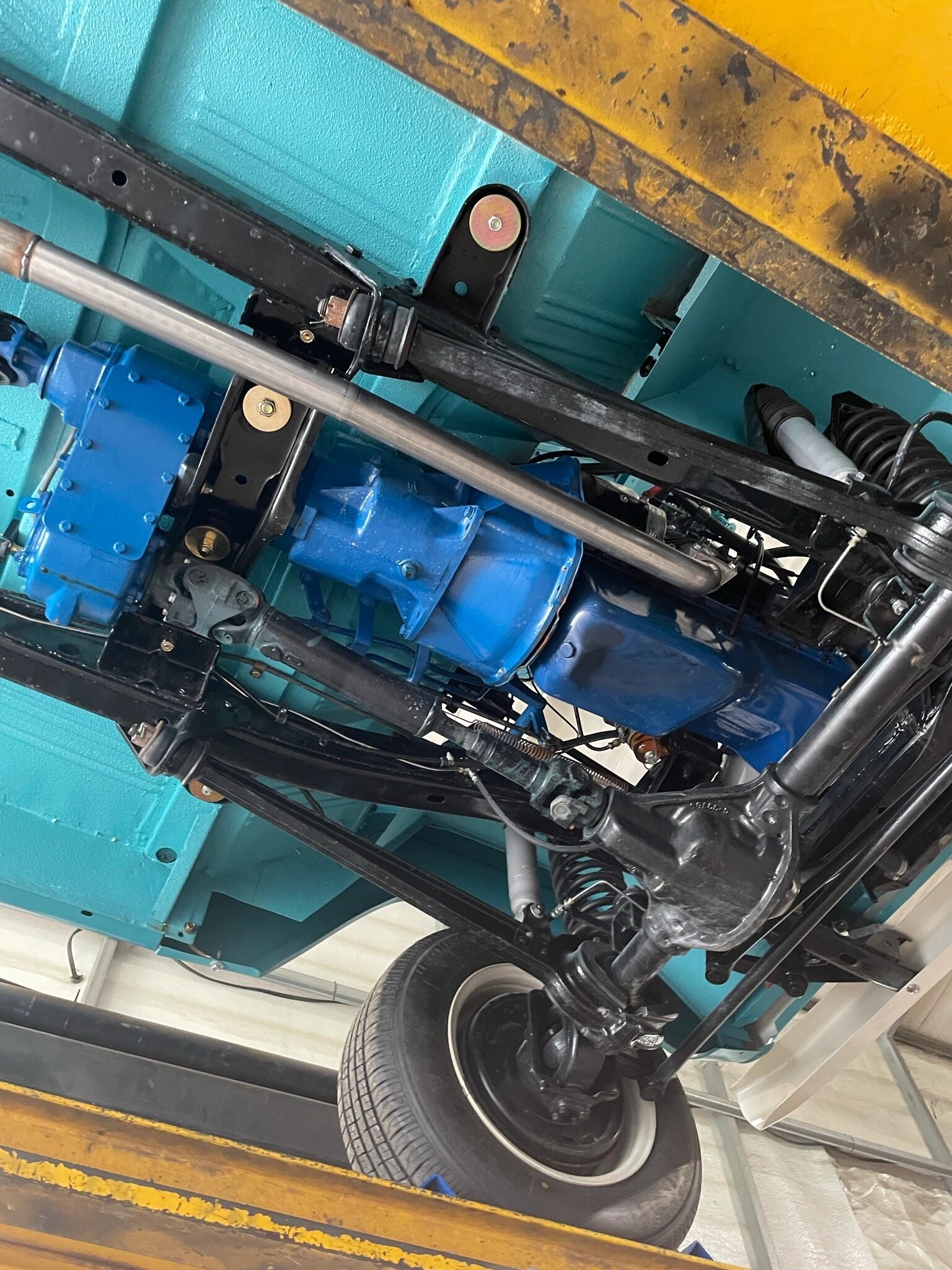 The body was removed from the frame and repainted its current shade of blue with a white roof, grille, and bumpers.