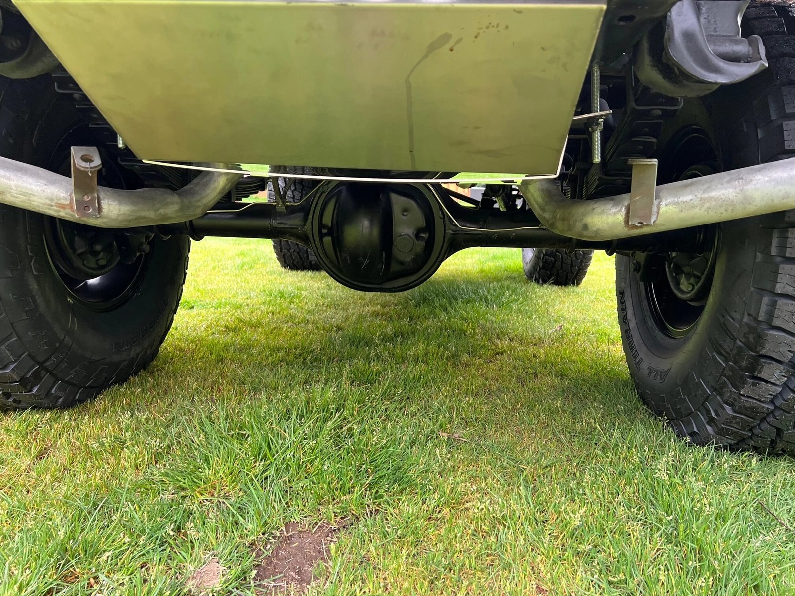 Additional modifications include a roll cage, a suspension lift, front disc brakes, power steering, 16″ wheels, LED lighting, aftermarket bumpers, Dakota Digital gauges, and tubular headers with a dual exhaust system.