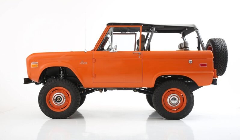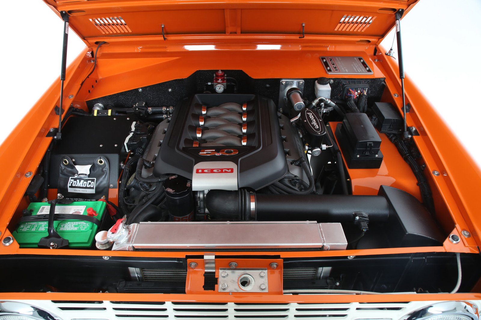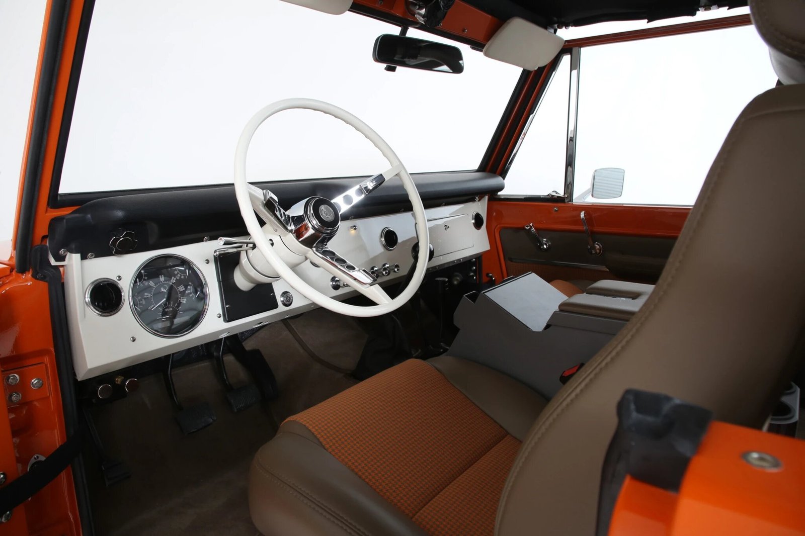 This ICON Old School BR will be the first example of ICON’s newest creation, a 1966 Ford Bronco reengineered with modern performance and reliability on a custom Art Morrison chassis. This edition retains more of the truck’s original design character while featuring a new aluminum Ford 5.0-liter V8 mated to a 5-speed manual transmission and an Atlas II transfer case. The Bronco body is finished in glossy orange over beige Carlyle leather upholstery featuring orange houndstooth inserts.