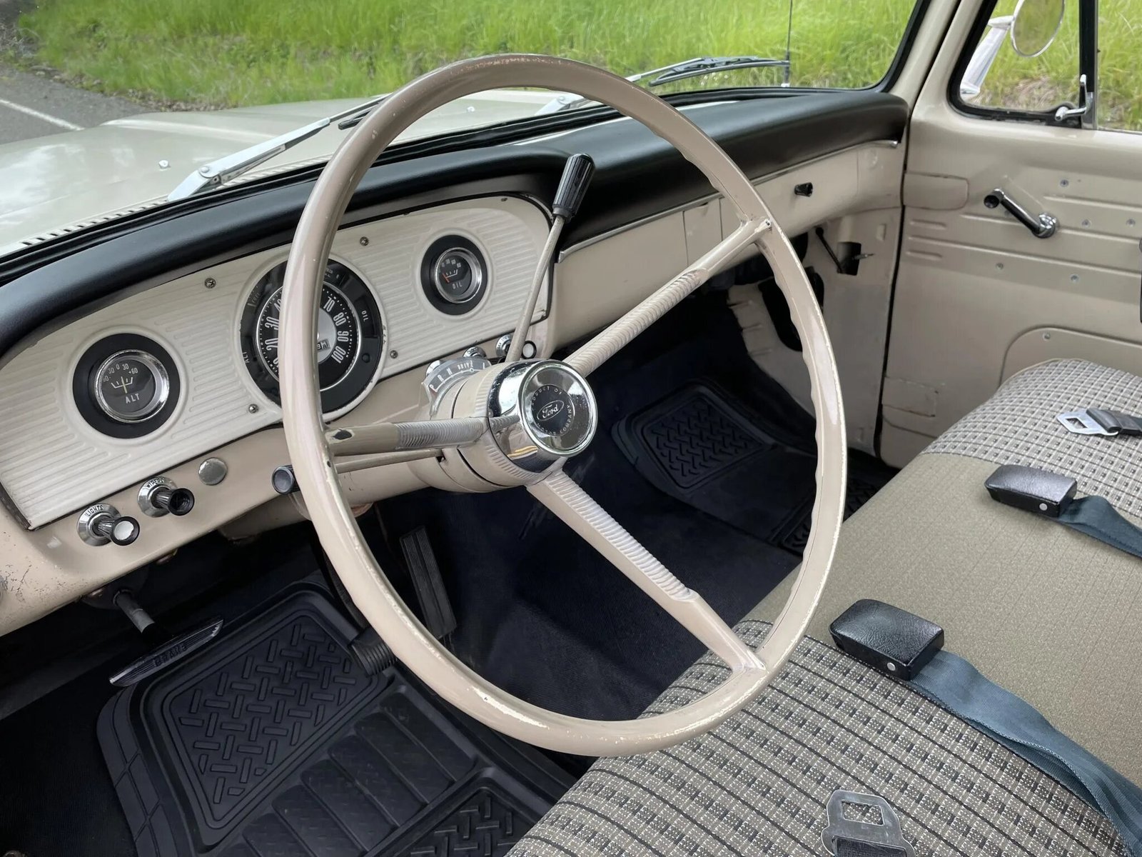 The cabin features a bench seat trimmed in beige vinyl with cloth inserts.
