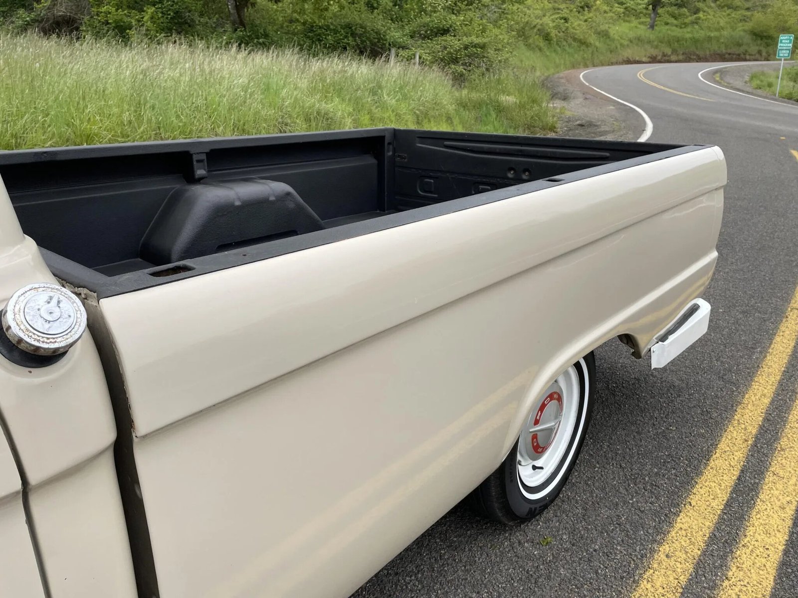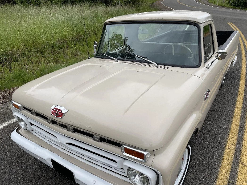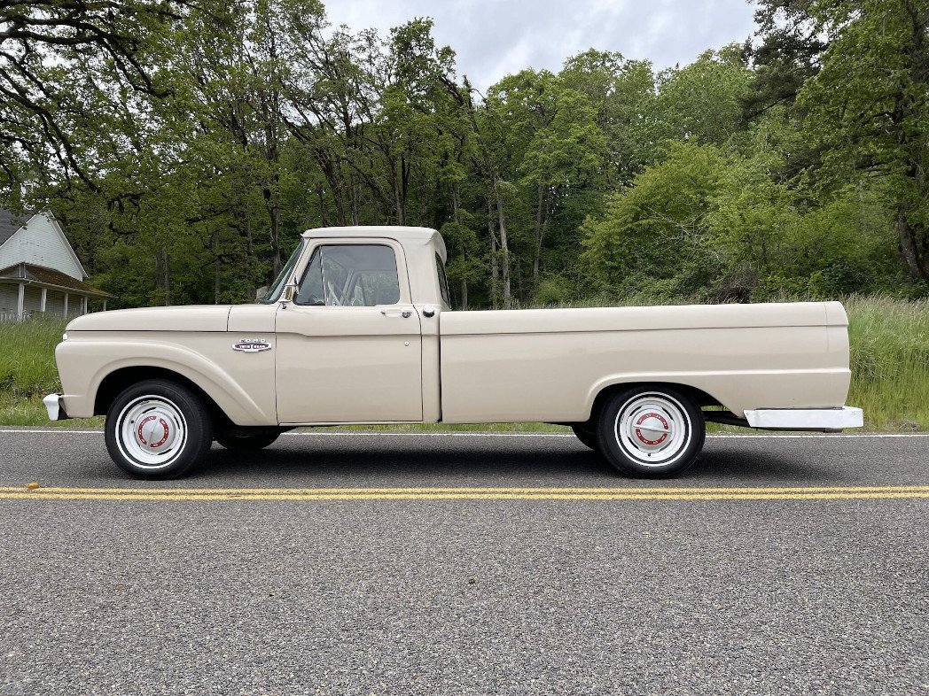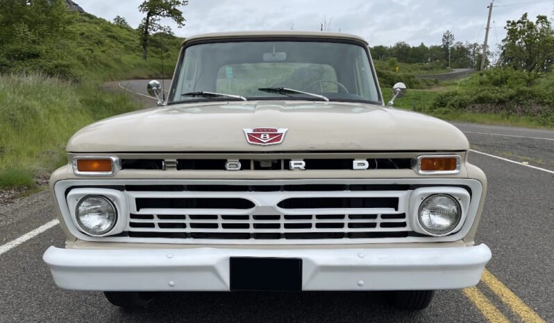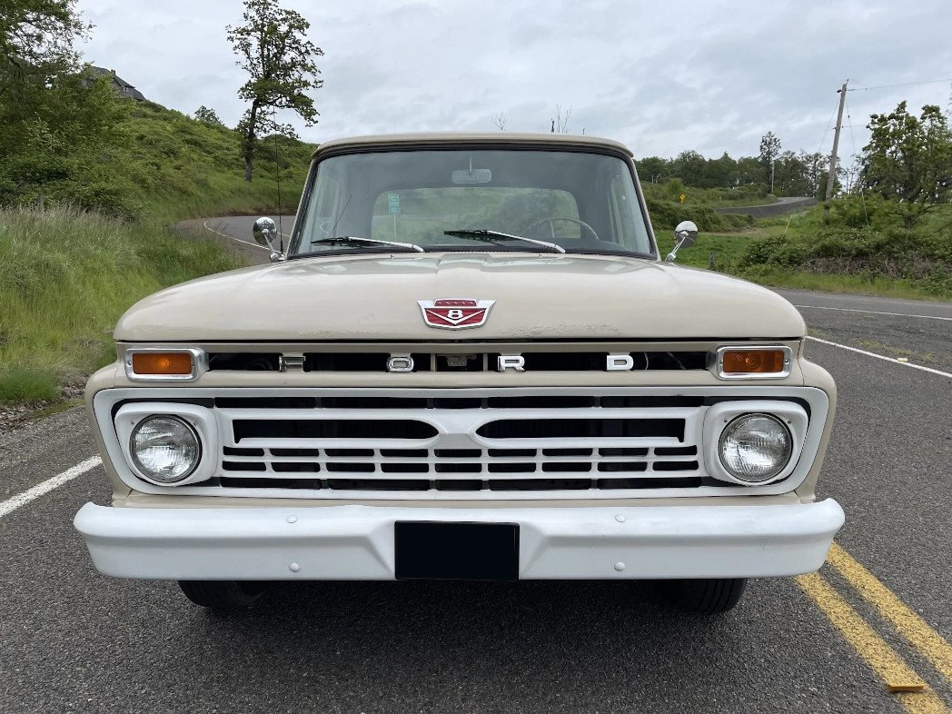 This 1966 Ford F-100 is finished in beige over matching upholstery and is powered by a 352ci V8 paired with a three-speed automatic transmission.