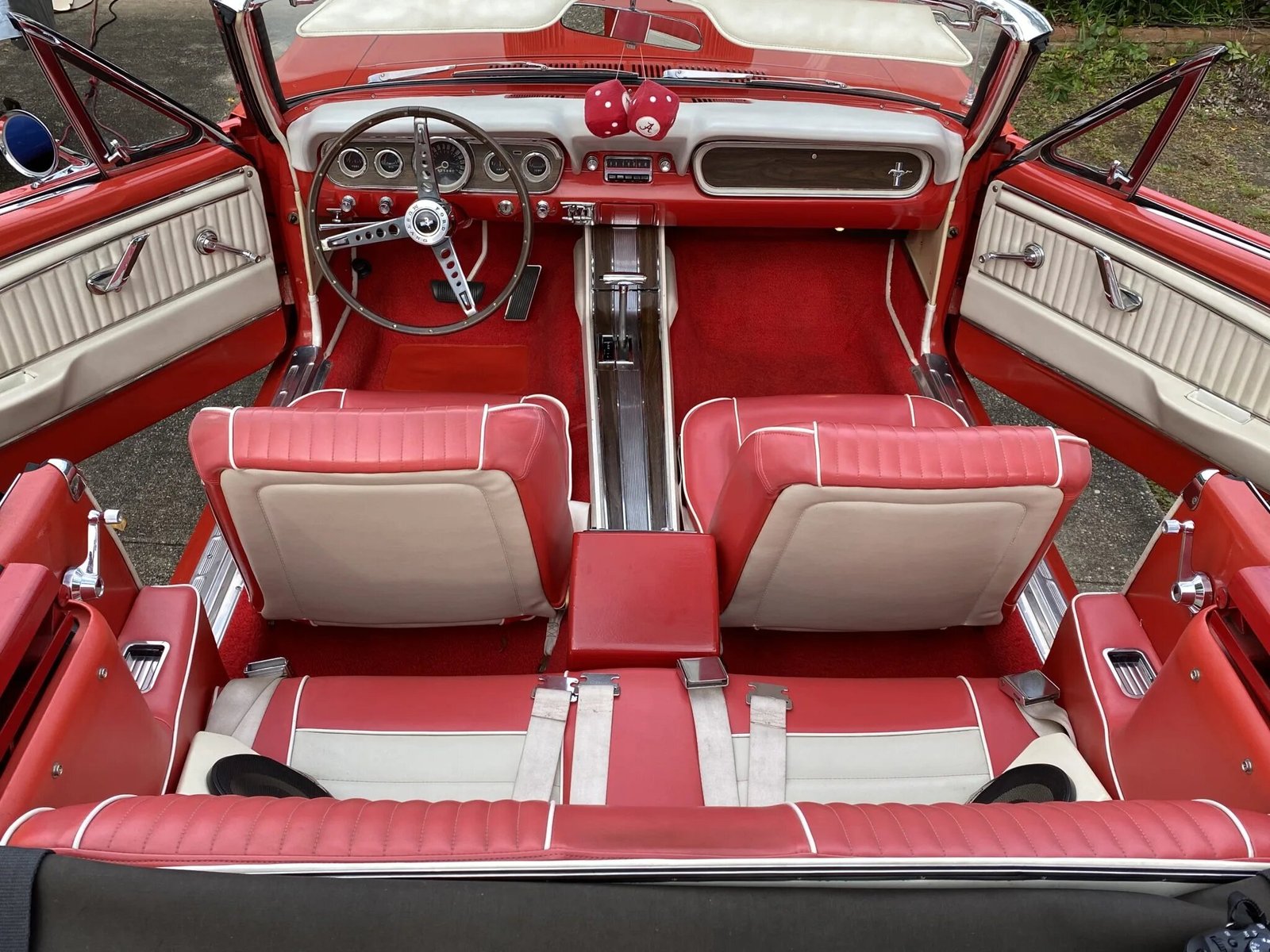 The interior have been refurbished and features two-tone red and white ‘Pony’ seat upholstery with a matching dashboard, door panels, and trunk linings.