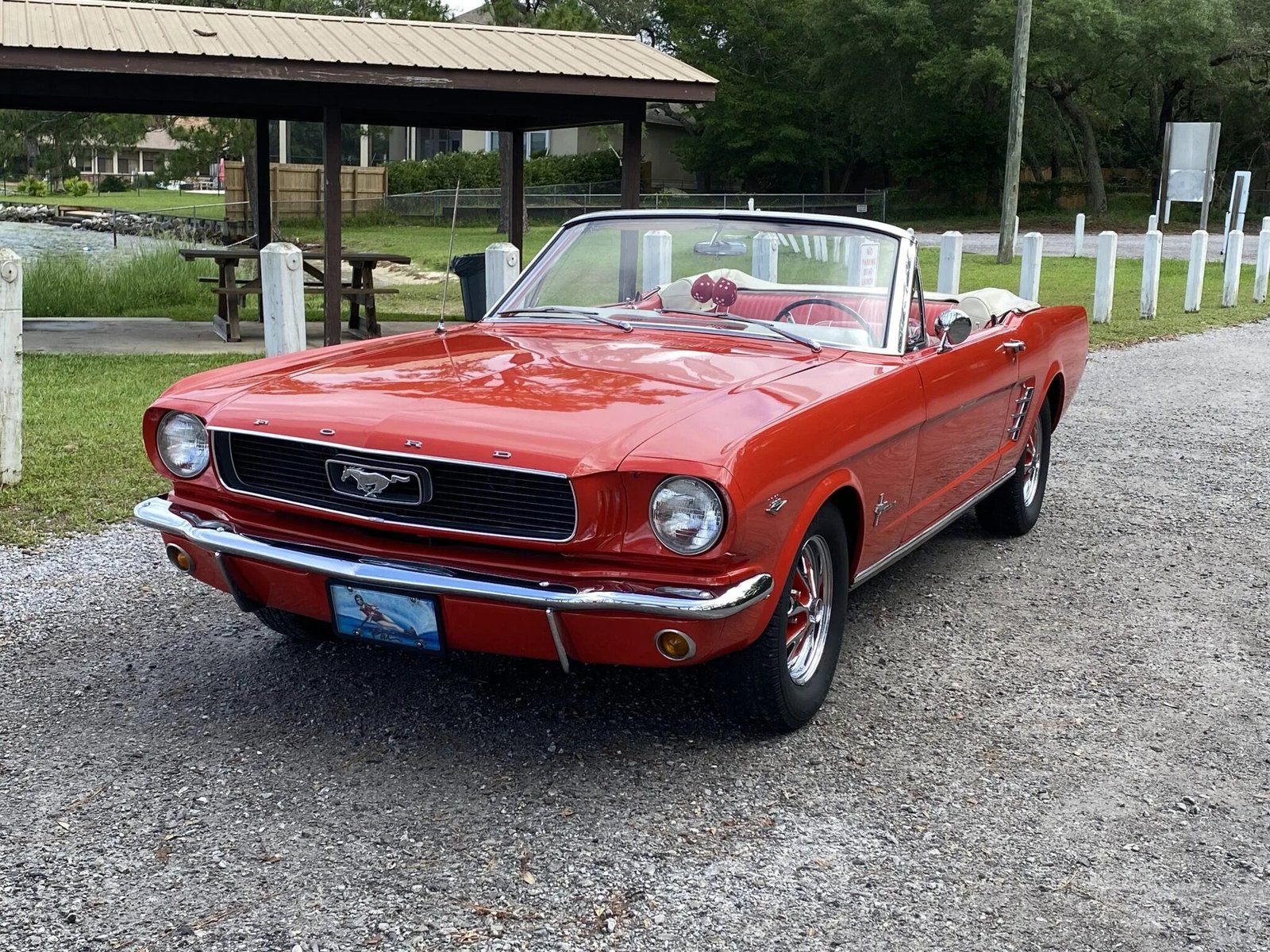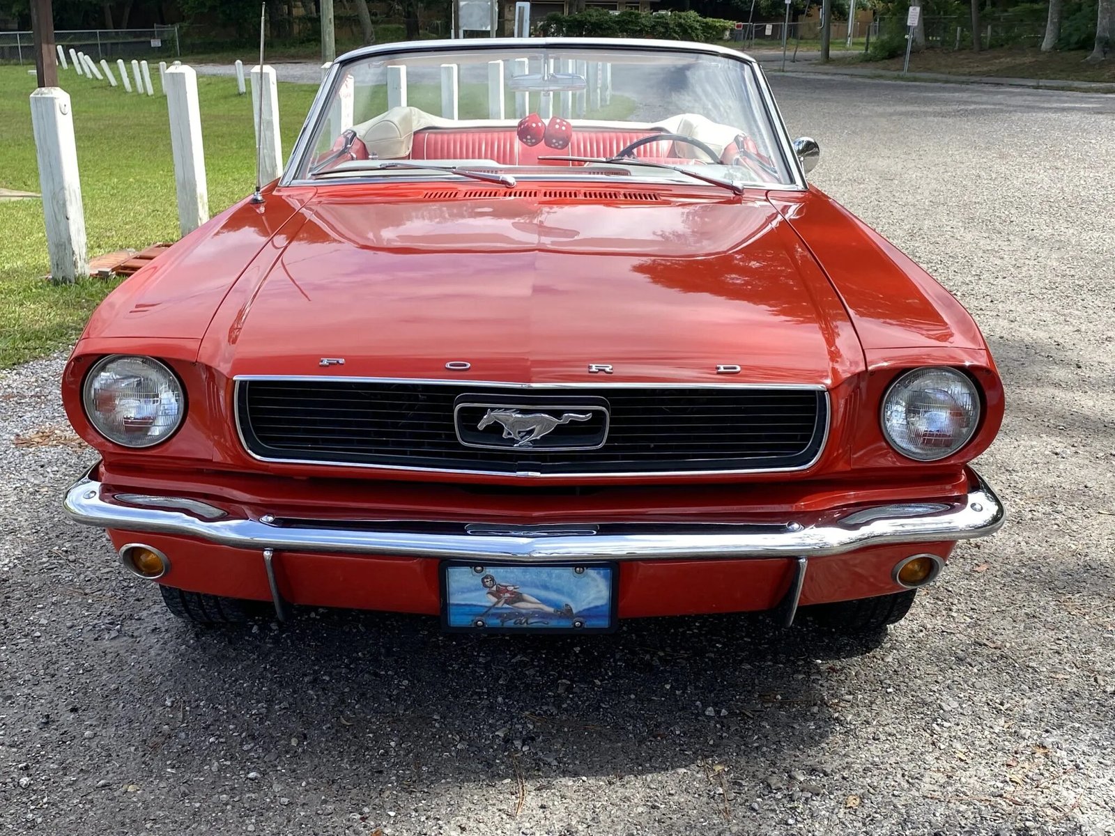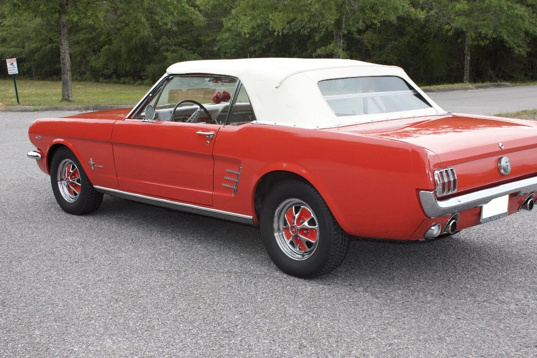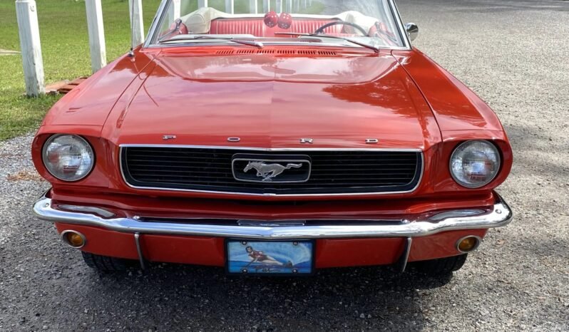 This 1966 Ford Mustang convertible is finished in red over two-tone red and white upholstery and is powered by a 289ci V8 paired with a three-speed C4 automatic transmission.