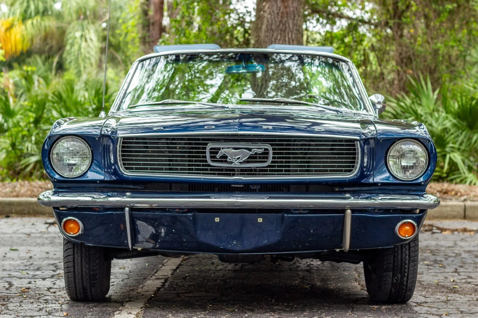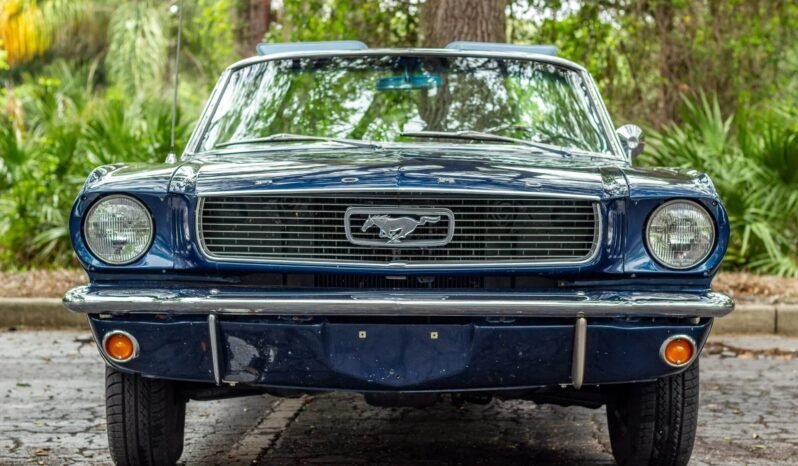 This 1966 Ford Mustang convertible is finished in blue over blue and white vinyl and powered by a 289ci V8 paired with a three-speed automatic transmission.