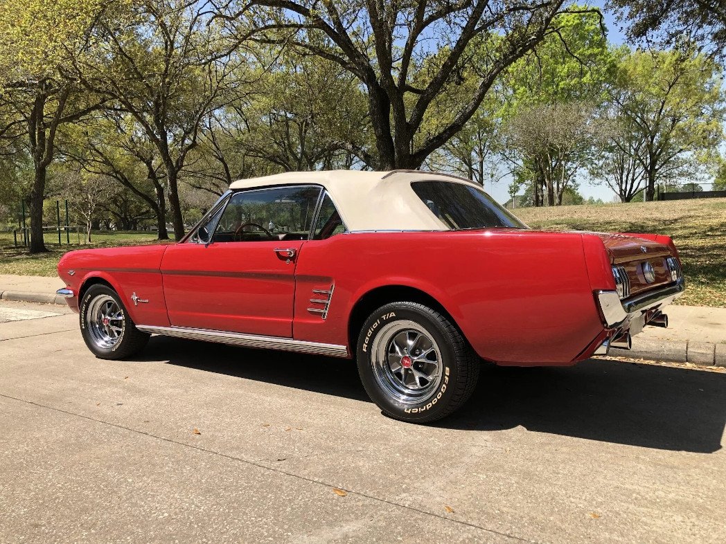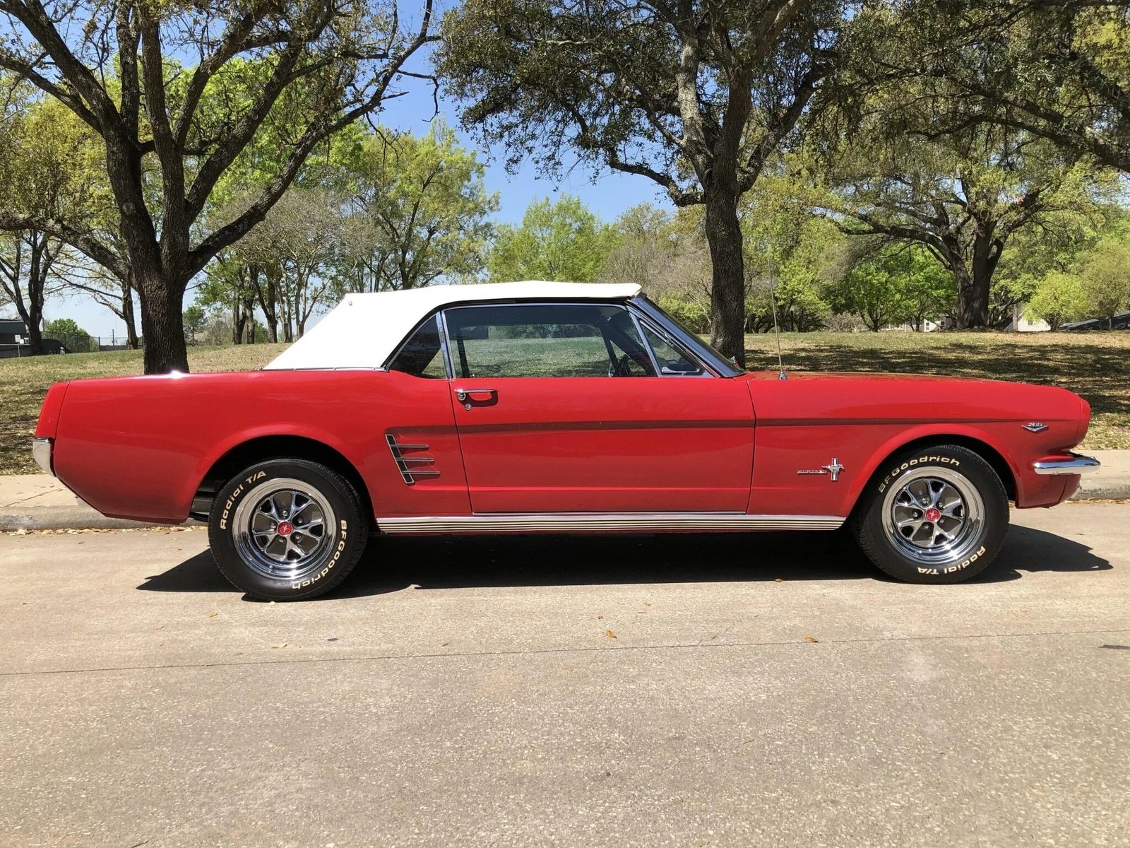 This 1966 Ford Mustang convertible is finished in red over red and is powered by a 289ci V8 paired with a four-speed manual transmission.