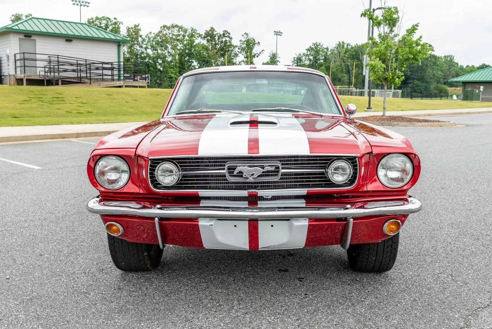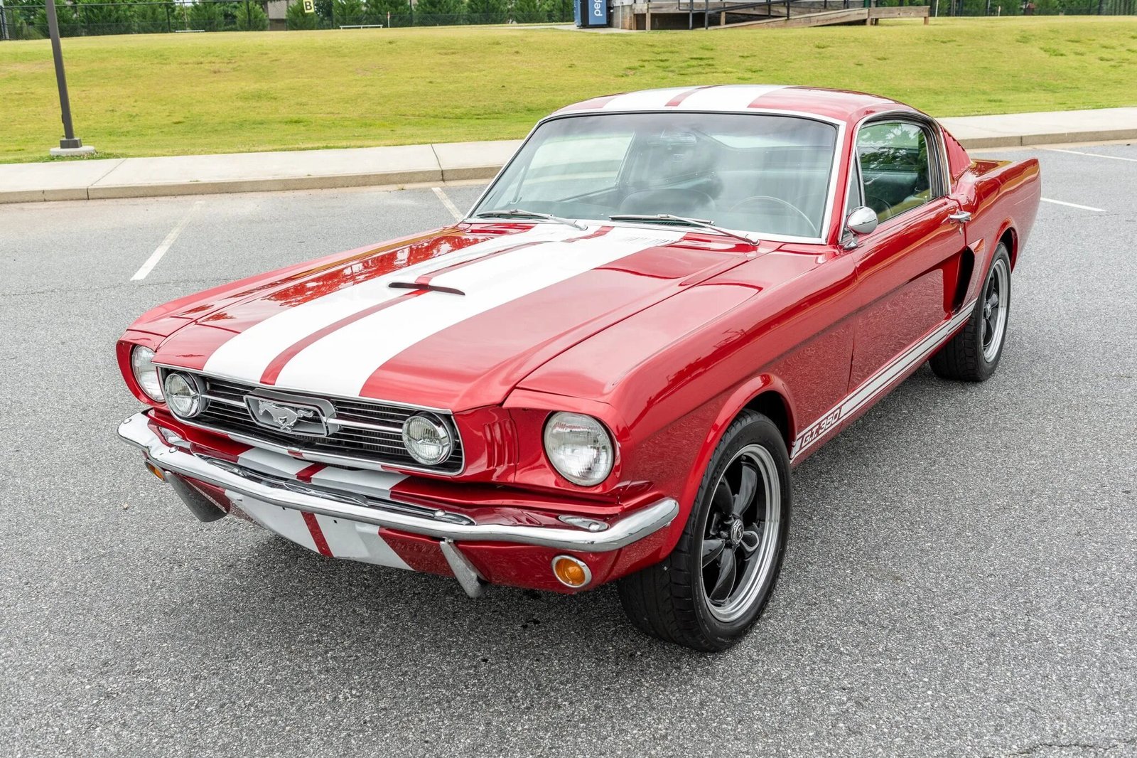 This 1966 Ford Mustang fastback is powered by a replacement 351ci Windsor V8 paired with a Borg Warner T-5 five-speed manual transmission and is finished in red with white stripes over black upholstery.