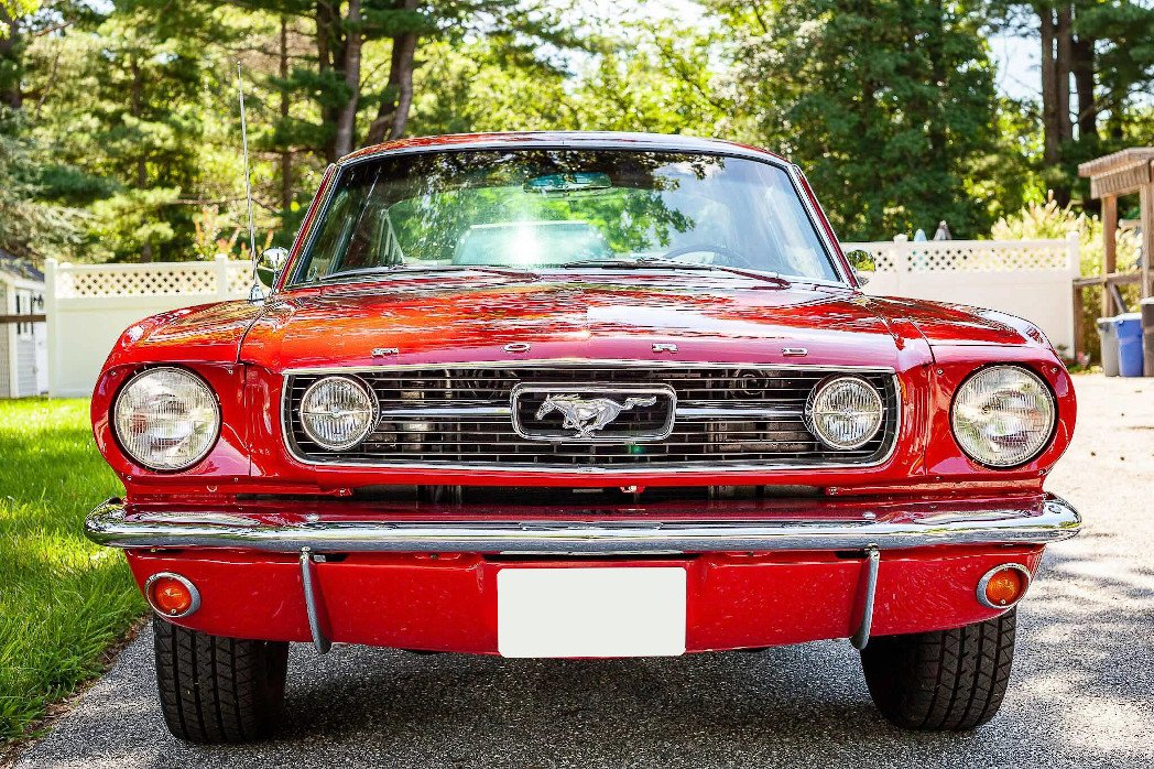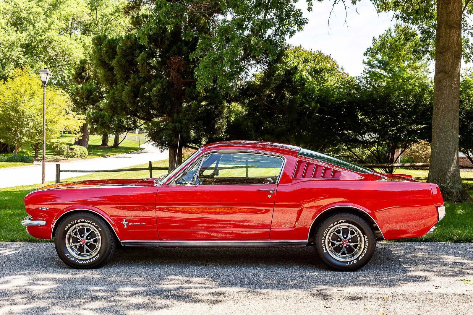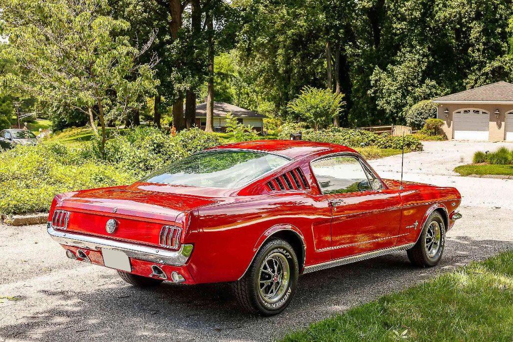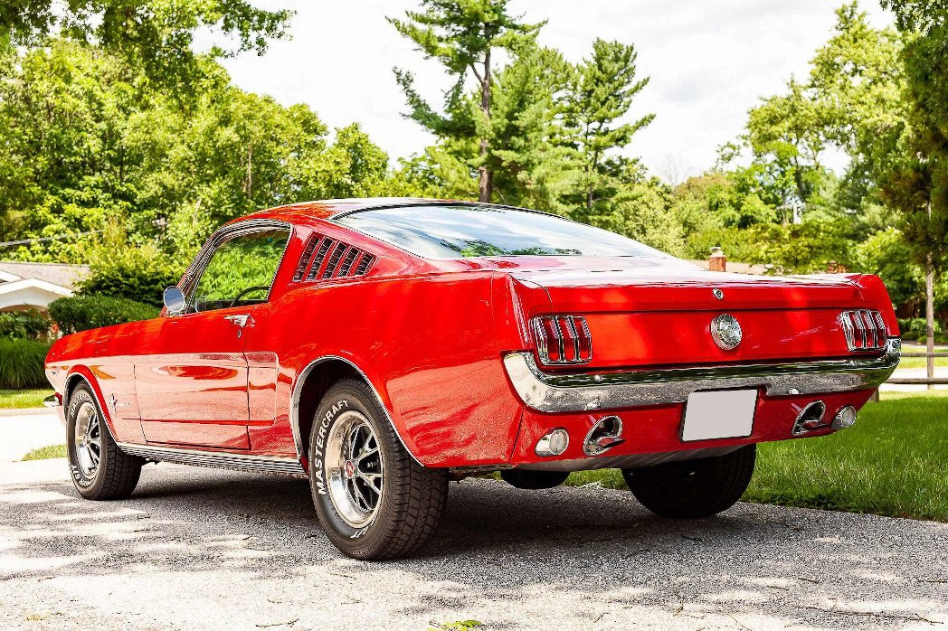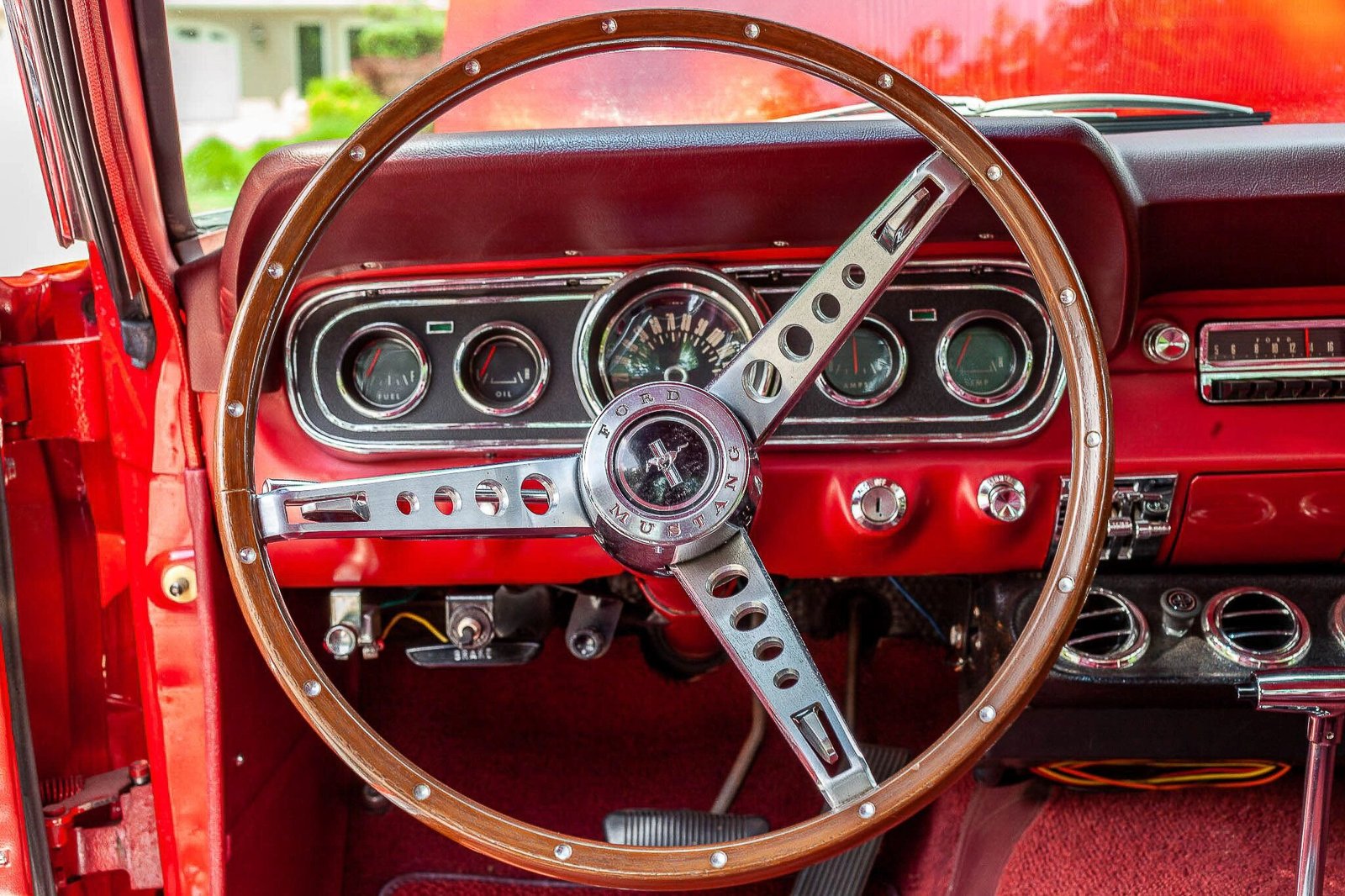 This 1966 Ford Mustang is a C-code fastback that is finished in red over red, and its 289ci V8 is paired with a three-speed automatic transmission.