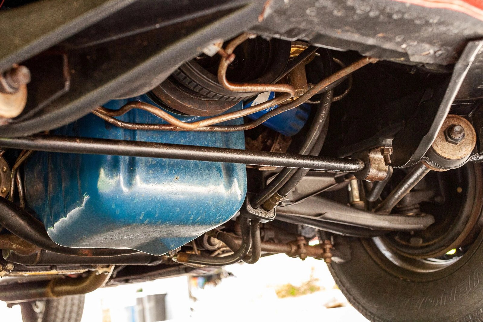The 289ci V8 is finished in blue and topped with a two-barrel carburetor.