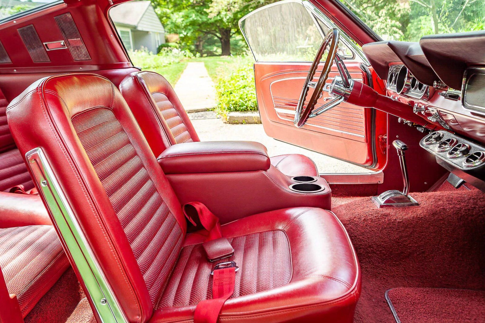The car left the factory with a red interior, which features front bucket seats, a rear bench, and an aftermarket armrest console with cupholders.
