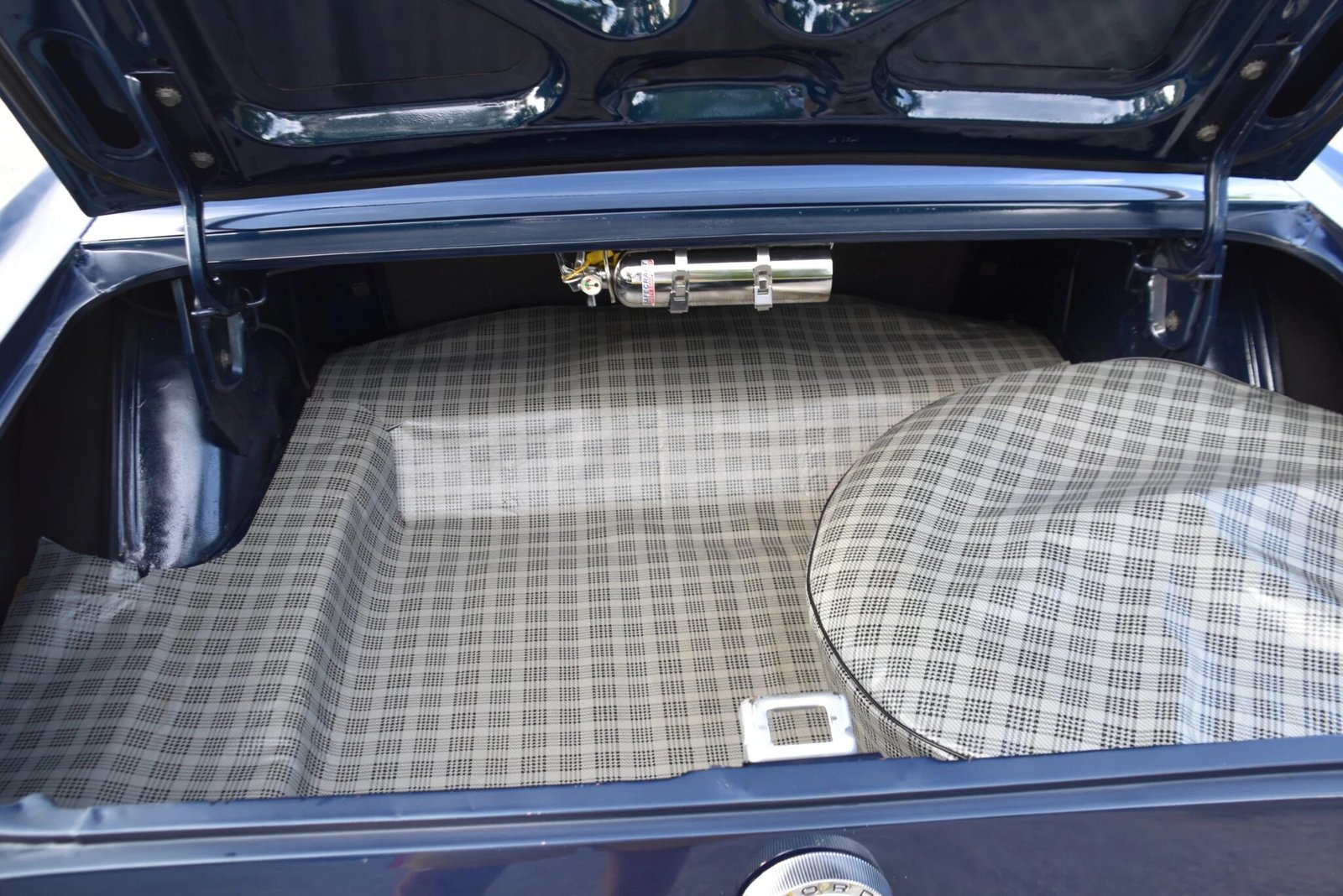 The interior decor group included pony-pattern upholstery in Parchment vinyl, and the interior is accented with a blue dash pad, carpets, and deluxe seatbelts.