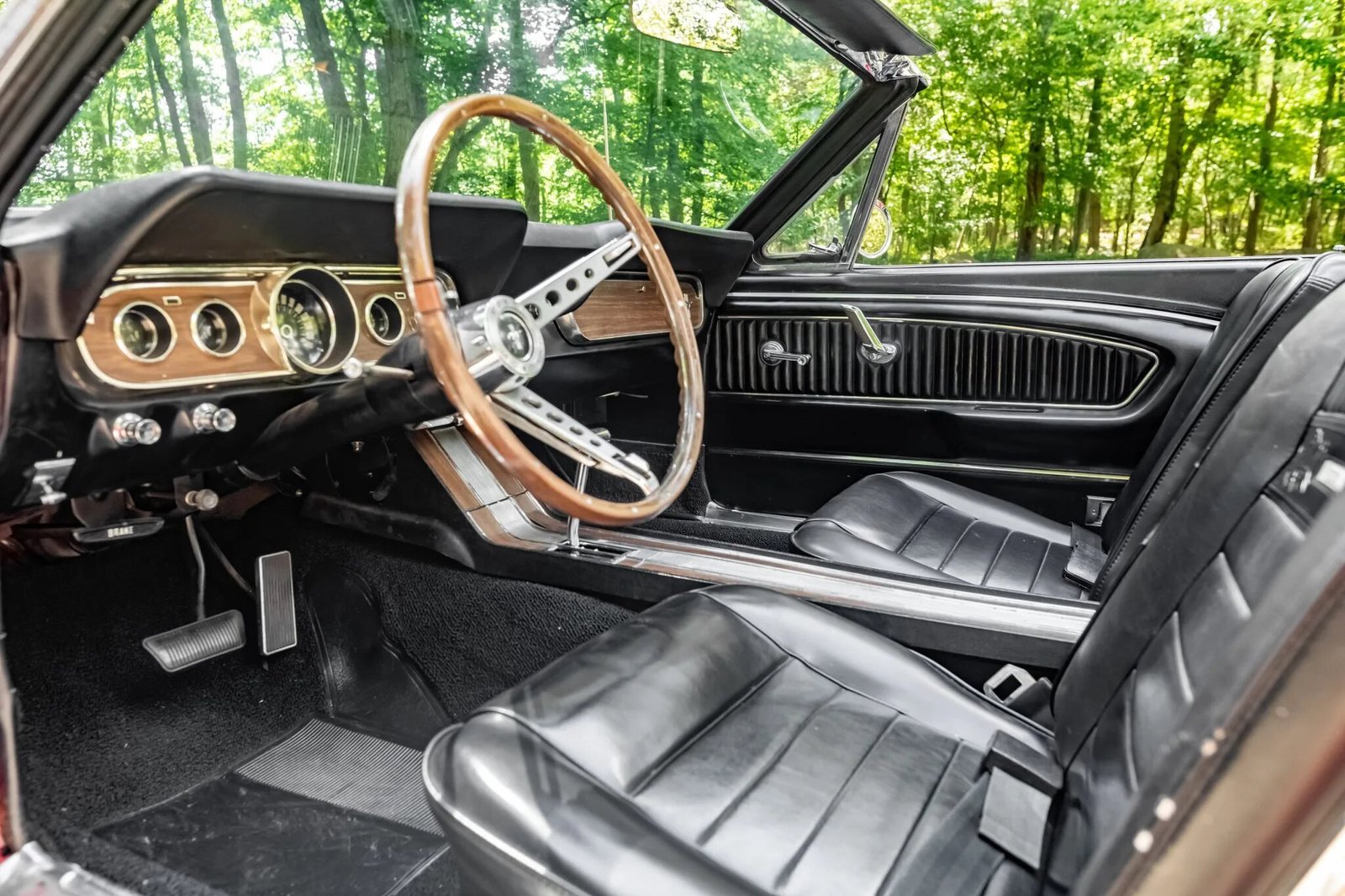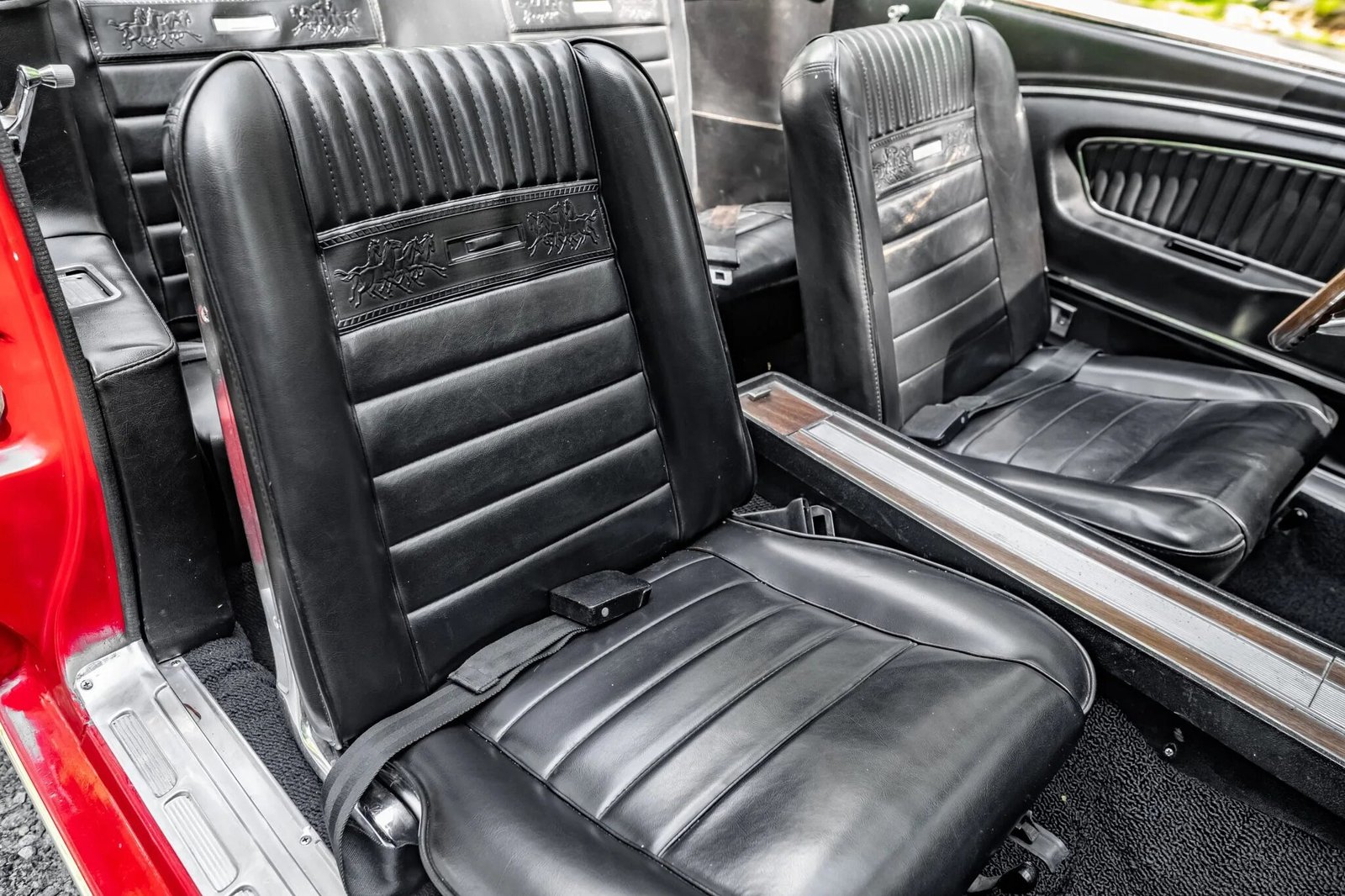 The front bucket seats and rear bench have been reupholstered in Luxury-style black vinyl with embossed running horse emblems.