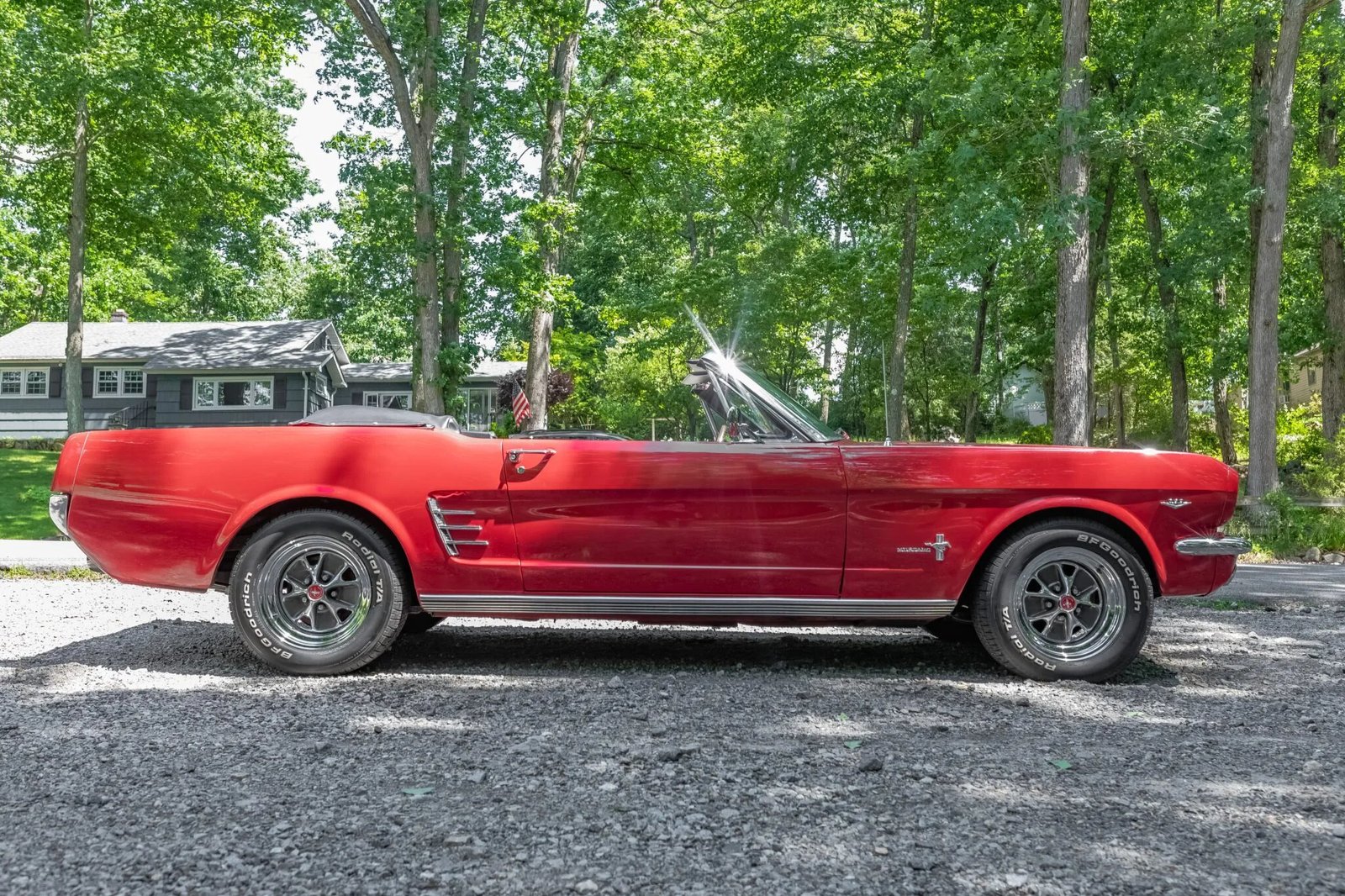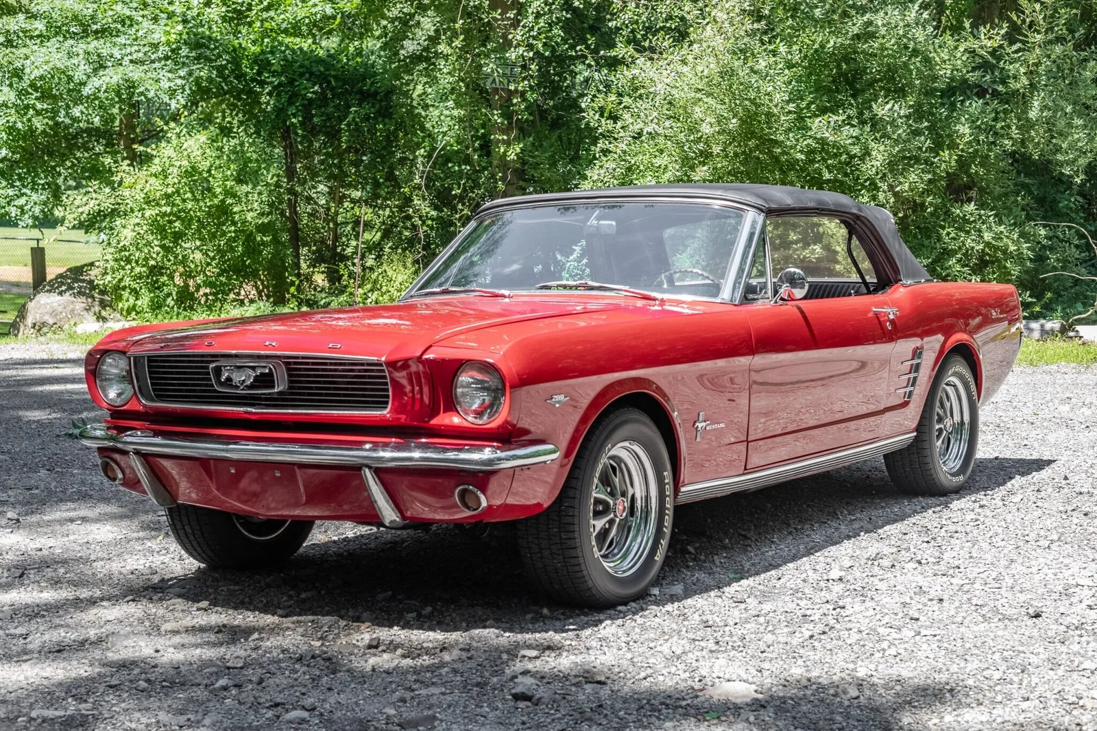 Power comes from a 289ci V8 paired with a three-speed automatic transmission, and the car has been repainted red over a black interior.