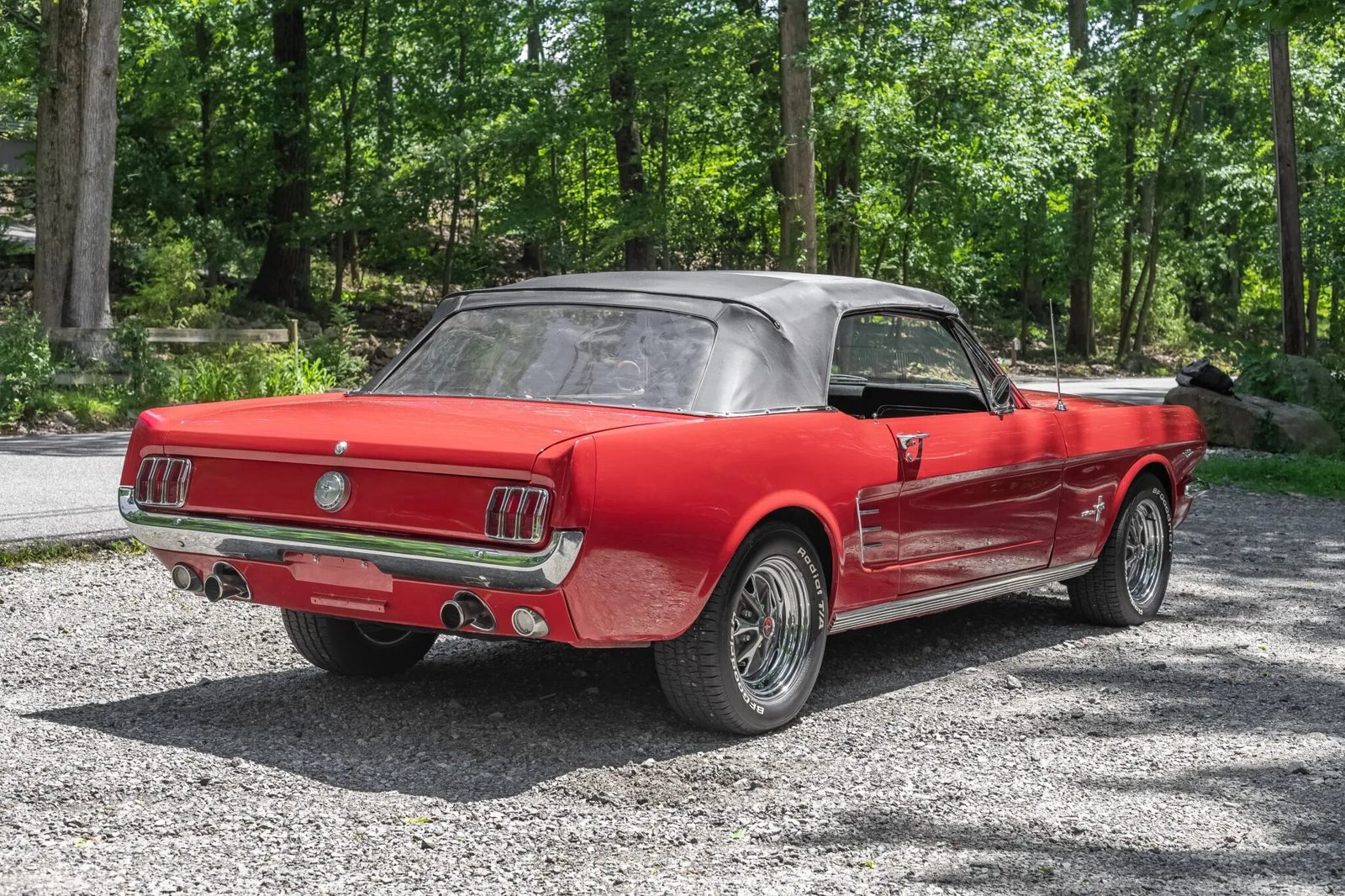 Reproduction 15″ styled steel wheels are mounted with 225/60 BFGoodrich Radial T/A tires, and the car is equipped with power-assisted brakes and steering.