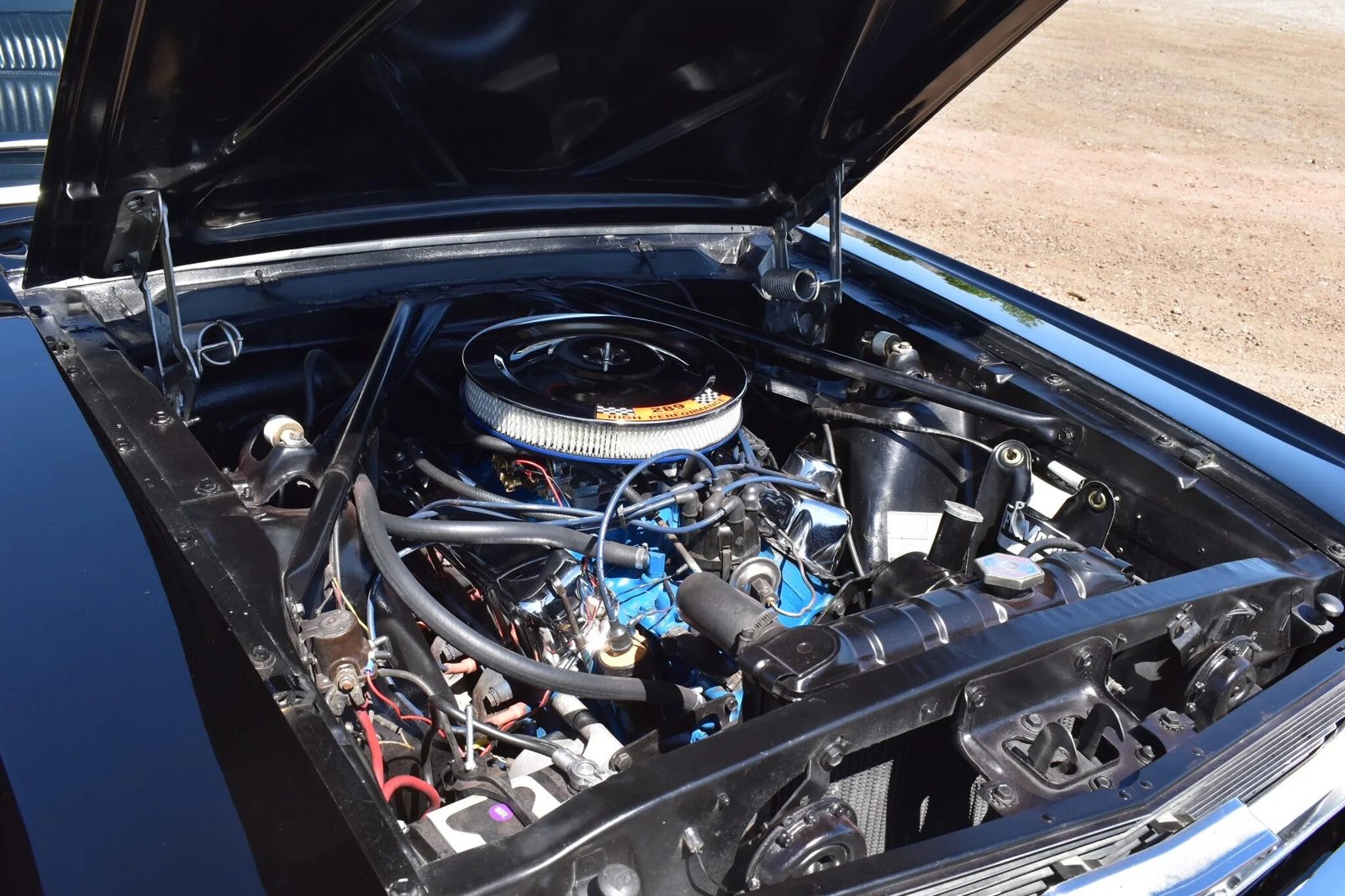The 289ci V8 is equipped with an Edelbrock four-barrel carburetor. An on oil change was performed in preparation for sale and an engine dress-up kit and replacement heater hoses were installed in 2021.