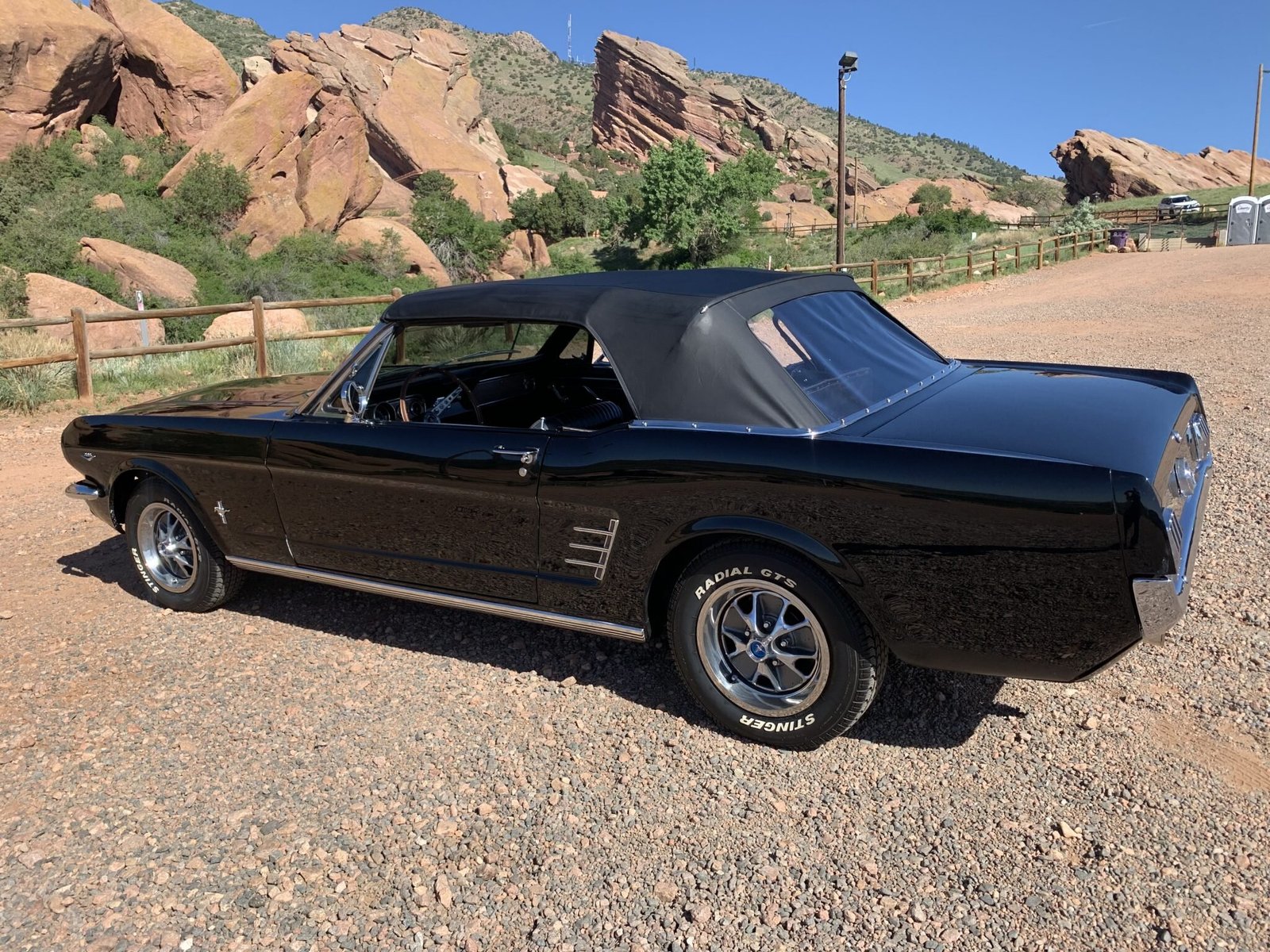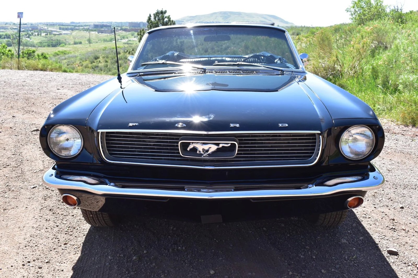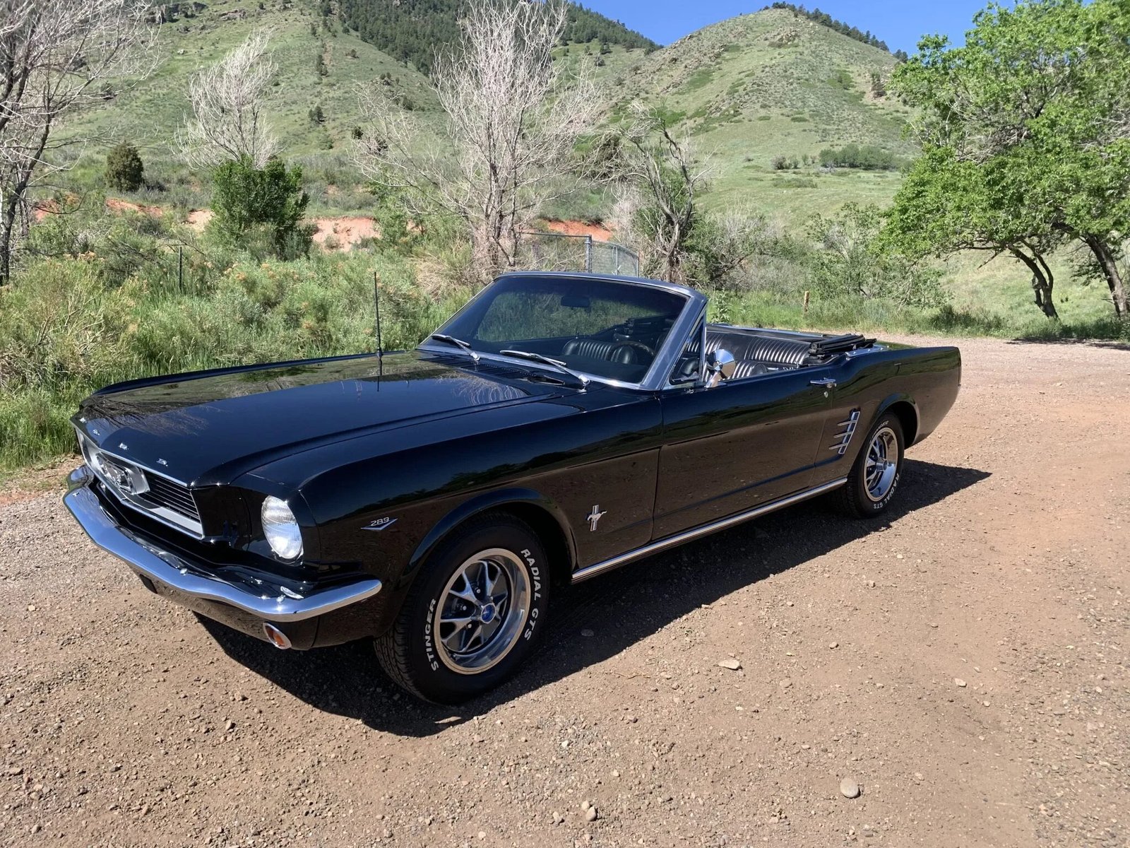 This 1966 Ford Mustang is a triple-black convertible powered by a 289ci V8 paired with a three-speed automatic transmission.