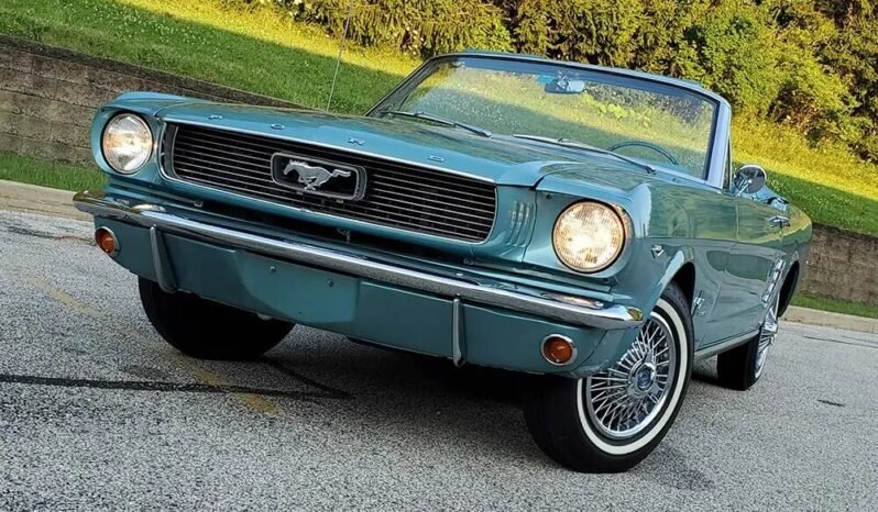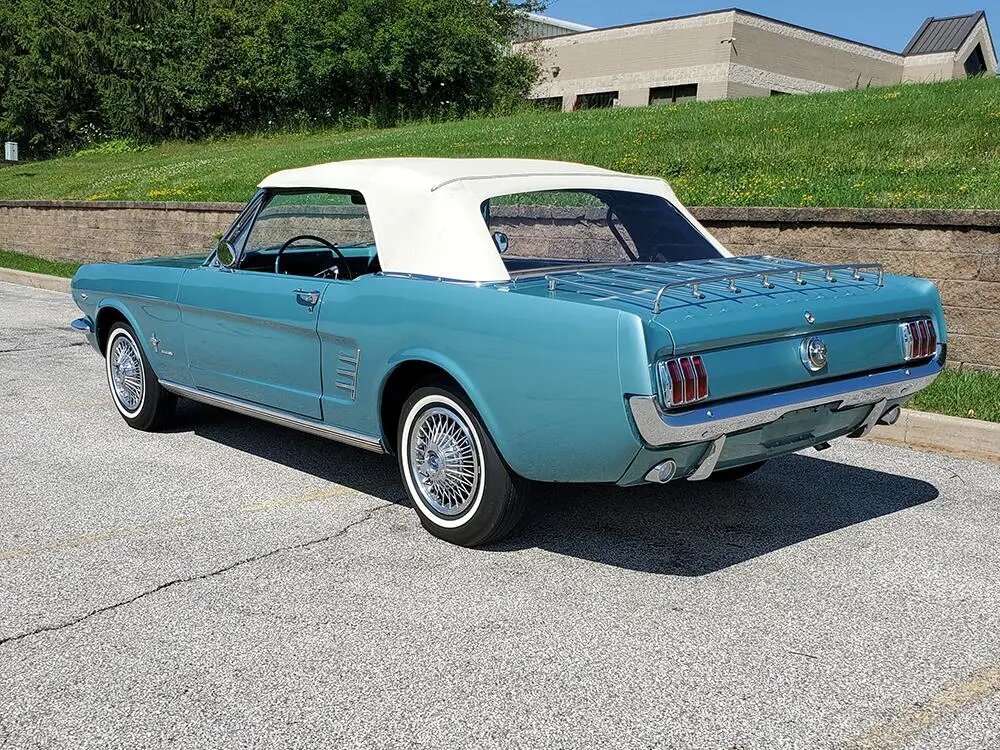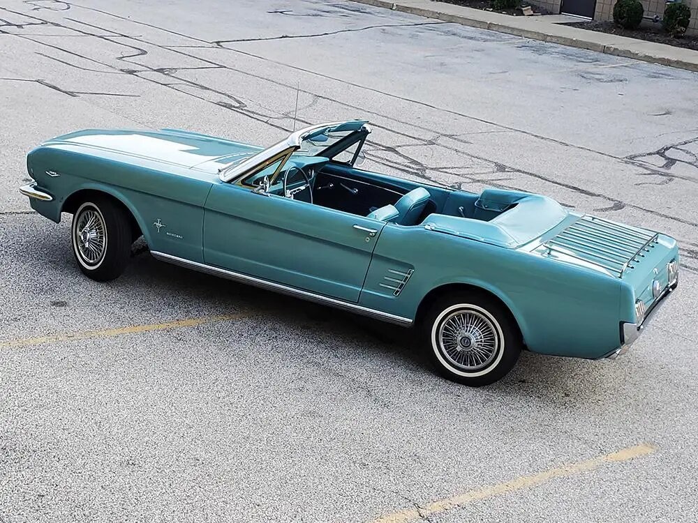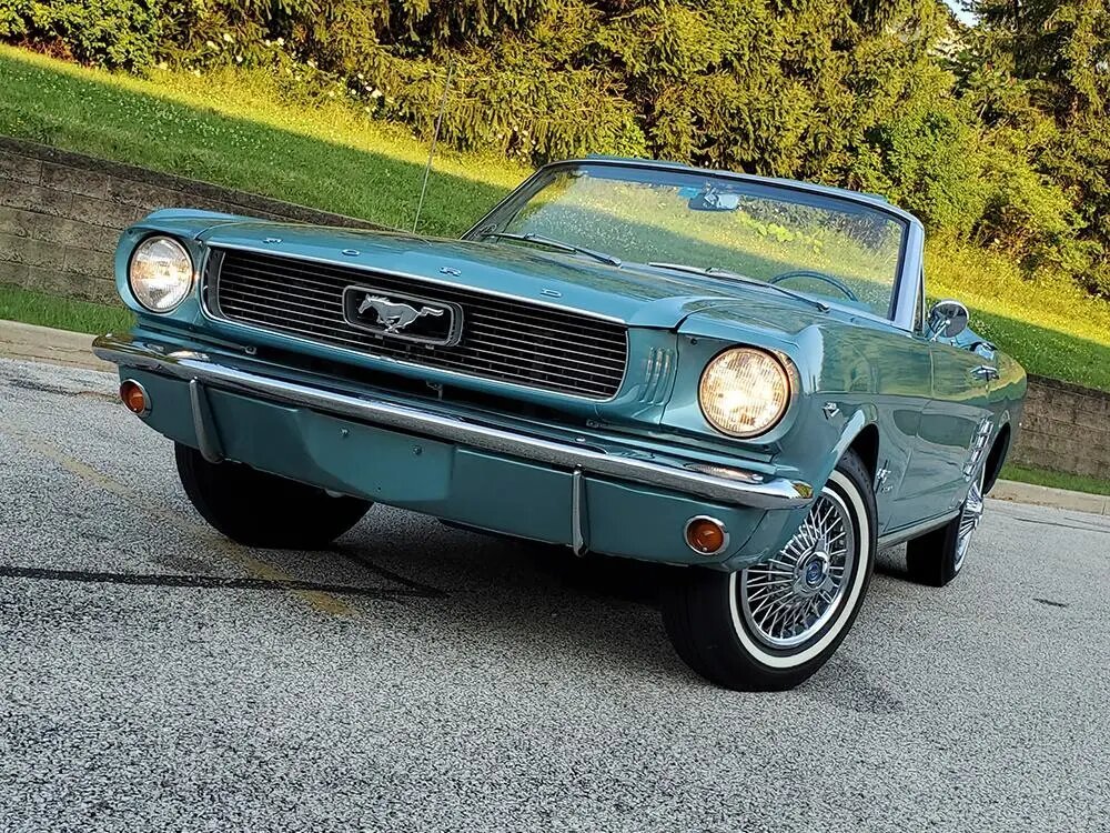 This 1966 Ford Mustang convertible is finished in Tahoe Turquoise over a matching interior and is powered by a 289ci V8 paired with a three-speed automatic transmission.