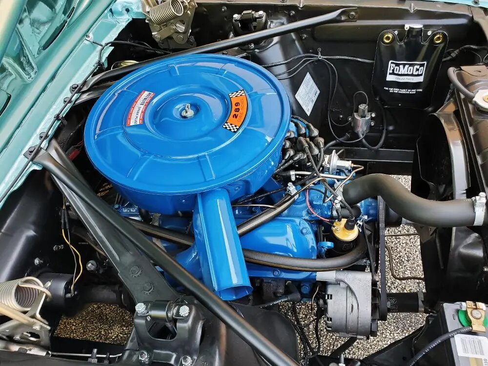 This 289ci V8 is equipped with a replacement wiring harness, gas tank, and exhaust system.